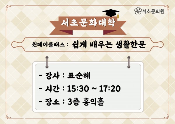 원데이 클래스 - 쉽게 배우는 생활한문 (10/07 ~ 10/07) 페이지 정보 작성자 서초문화원 작성일21-10-01 13:00 조회1,401회 댓글0건 이전글 다음글 목록 본문 원데이 클래스 - 쉽게 배우는 생활한문 댓글목록 등록된 댓글이 없습니다. 이전글 다음글 목록