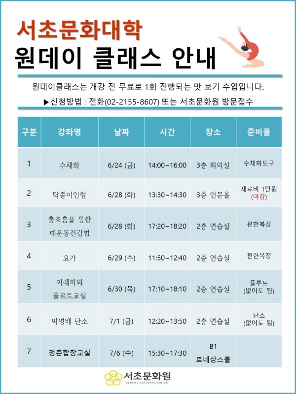 2022년 3분기 원데이클래스 일정 페이지 정보 작성자 서초문화원 작성일22-06-20 13:59 조회5,130회 댓글0건 관련링크 이전글 다음글 목록 본문 - 댓글목록 등록된 댓글이 없습니다. 이전글 다음글 목록