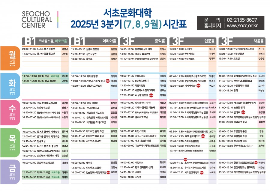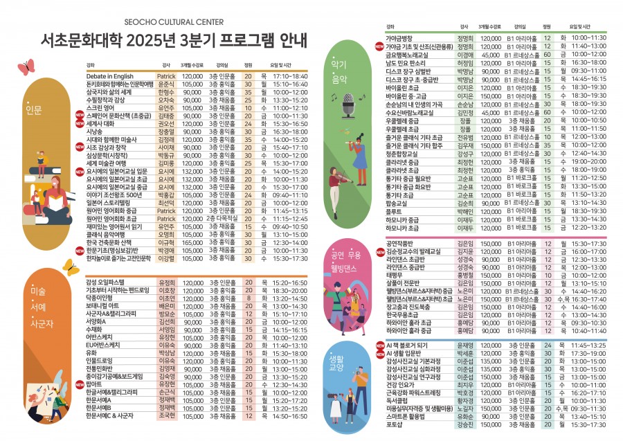 2025 서초문화대학 리플렛 (3분기) 페이지 정보 작성자 서초문화원 작성일25-08-19 19:28 조회1,151회 댓글0건 관련링크 이전글 목록 본문 3분기(7~9월)* 그림을 클릭하시면 크게 보실 수 있습니다. 이전글 목록