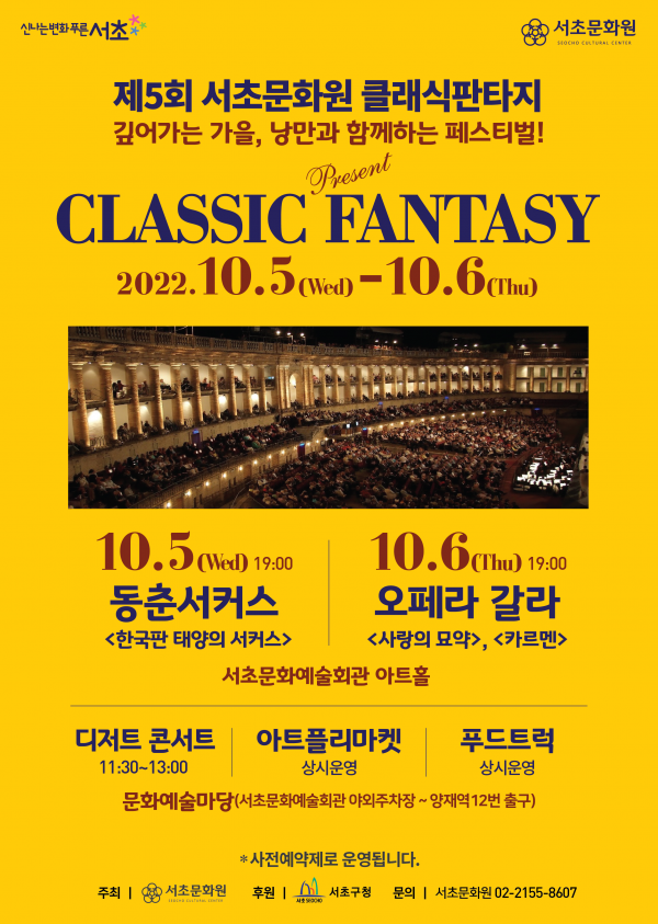 제5회 서초문화원 클래식 판타지 페이지 정보 작성자 서초문화원 작성일22-09-26 11:36 조회3,826회 댓글0건 관련링크 이전글 다음글 목록 본문 행사명 제5회 서초문화원 클래식 판타지 일시 2022.10.05(수) ~ 06(목) 장소 서초문화예술회관 아트홀 및 문화예술마당 공연정보 언론보도 이전글 다음글 목록