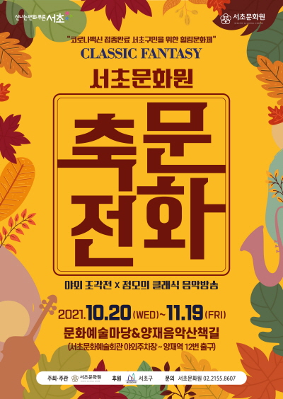 서초문화원 문화축전 페이지 정보 작성자 서초문화원 작성일21-10-12 14:18 조회4,421회 댓글0건 관련링크 이전글 다음글 목록 본문 행사명 서초문화원 문화축전 일시 2021.10.20(수) ~ 11.19(금) 장소 문화예술마당&양재음악산책길 공연정보 <서초문화원의 가을축전>은 클래식음악을 기반으로한 조각전으로문화예술마당(서초문화예술회관 야외주차장)과 양재음악산책길에서 진행된다.방문객들이 산책하듯 편안한 분위기 속에서 조각작품을 감상할 수 있으며,정오에는 고품격 클래식 음악방송이 진행된다. 언론보도 이전글 다음글 목록