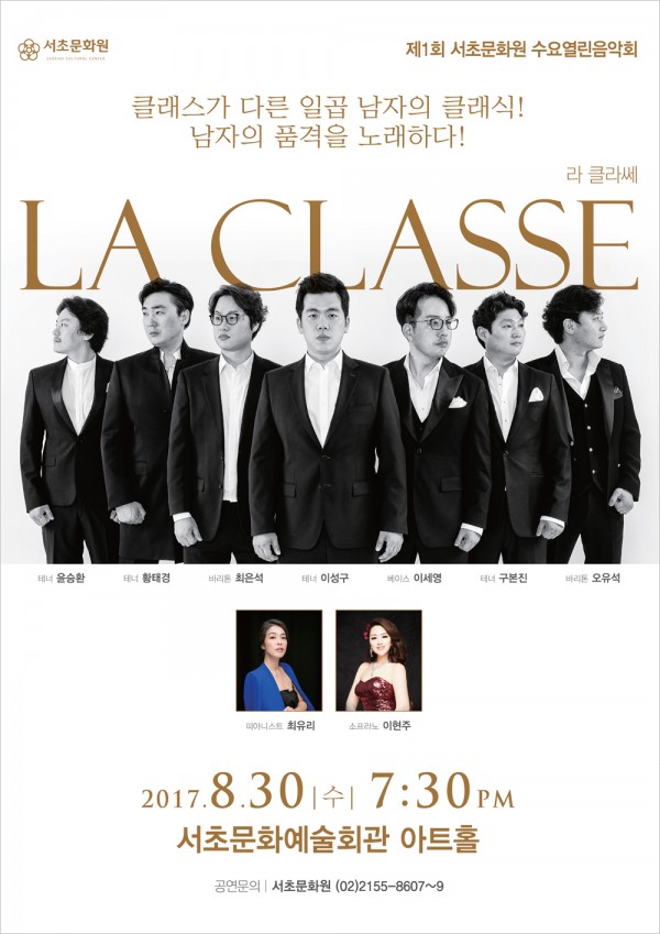 제1회 수요열린음악회 <라클라쎄 콘서트> 페이지 정보 작성자 최고관리자 작성일17-12-19 17:02 조회7,728회 댓글0건 관련링크 이전글 목록 본문 행사명 제1회 수요열린음악회 <라클라쎄 콘서트> 일시 2017년 08월 30일(수) 19:30 장소 서초문화예술회관 아트홀 공연정보 클래스가 다른 서초구 팬텀싱어! '라 클라쎄(La Classe)'의 콘서트로 뮤지컬부터 오페라, 영화 OST, 가곡, 가요까지 천상의 목소리와 환상의 하모니로 다양한 장르의 음악을 선사합니다. 언론보도 . 이전글 목록