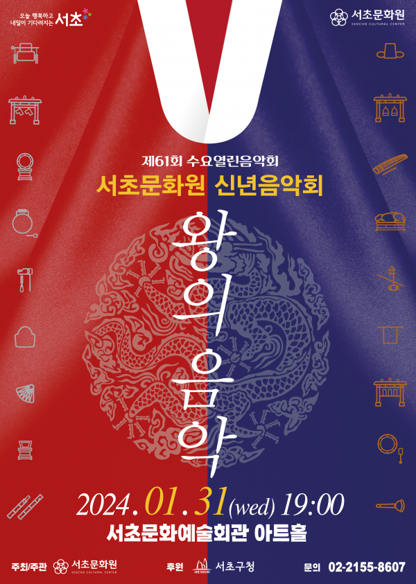 제61회 수요열린음악회 2024신년음악회 - 왕의음악 페이지 정보 작성자 서초문화원 작성일24-02-07 19:08 조회3,018회 댓글0건 관련링크 이전글 다음글 목록 본문 행사명 제61회 수요열린음악회 2024신년음악회 - 왕의음악 일시 2024.01.31 장소 서초문화예술회관 아트홀 공연정보 - 언론보도 - 이전글 다음글 목록