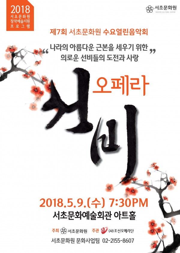 제7회 수요열린음악회 <오페라'선비'> 페이지 정보 작성자 최고관리자 작성일18-04-25 15:59 조회7,347회 댓글0건 관련링크 이전글 다음글 목록 본문 행사명 제7회 수요열린음악회 <오페라'선비'> 일시 2018.05.09(수) 7:30pm 장소 서초문화에술회관 아트홀 공연정보 2018 서초문화원 창작예술지원프로그램나라의 아름다운 근본을 세우기 위한 의로운 선비들의 도전과 사랑! 창작오페라 <선비>*출연진- 안향 : Bass 나의석- 주세붕 : Bar.서동희- 이덕인 : Ten.김재일- 유교선 : Sop.이소연 언론보도 . 이전글 다음글 목록
