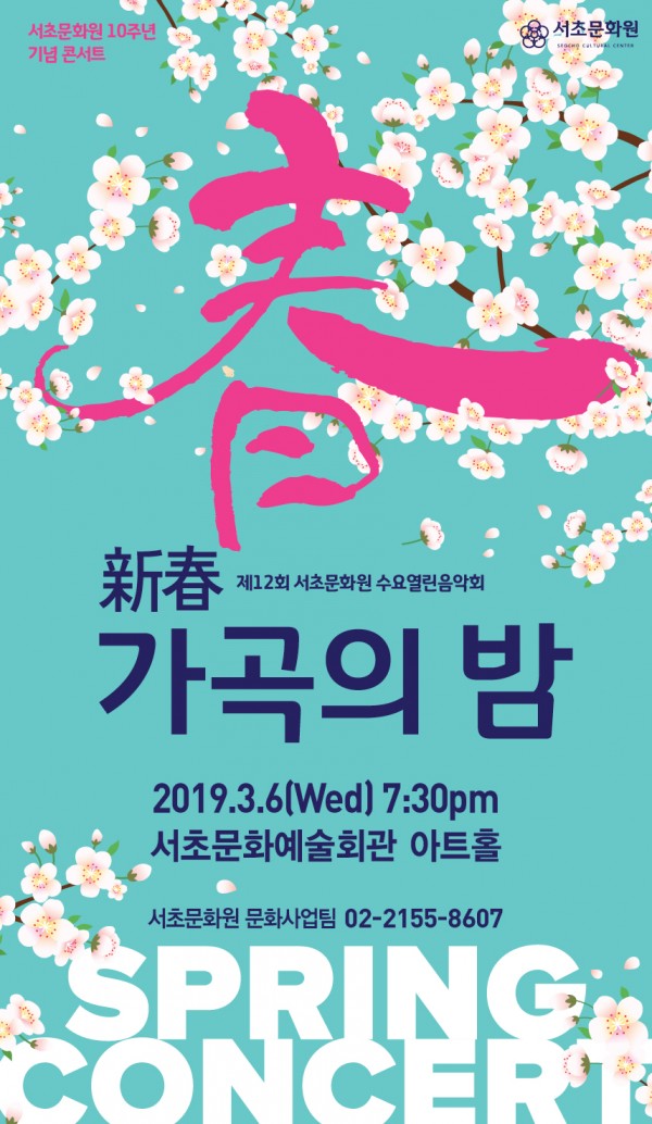 제12회 수요열린음악회 '新春가곡의밤' 페이지 정보 작성자 최고관리자 작성일19-02-25 09:57 조회7,508회 댓글0건 관련링크 이전글 다음글 목록 본문 행사명 제12회 수요열린음악회 '新春가곡의밤' 일시 2019년 3월 6일(수) 19:30 장소 서초문화예술회관 아트홀 공연정보 언론보도 . 이전글 다음글 목록