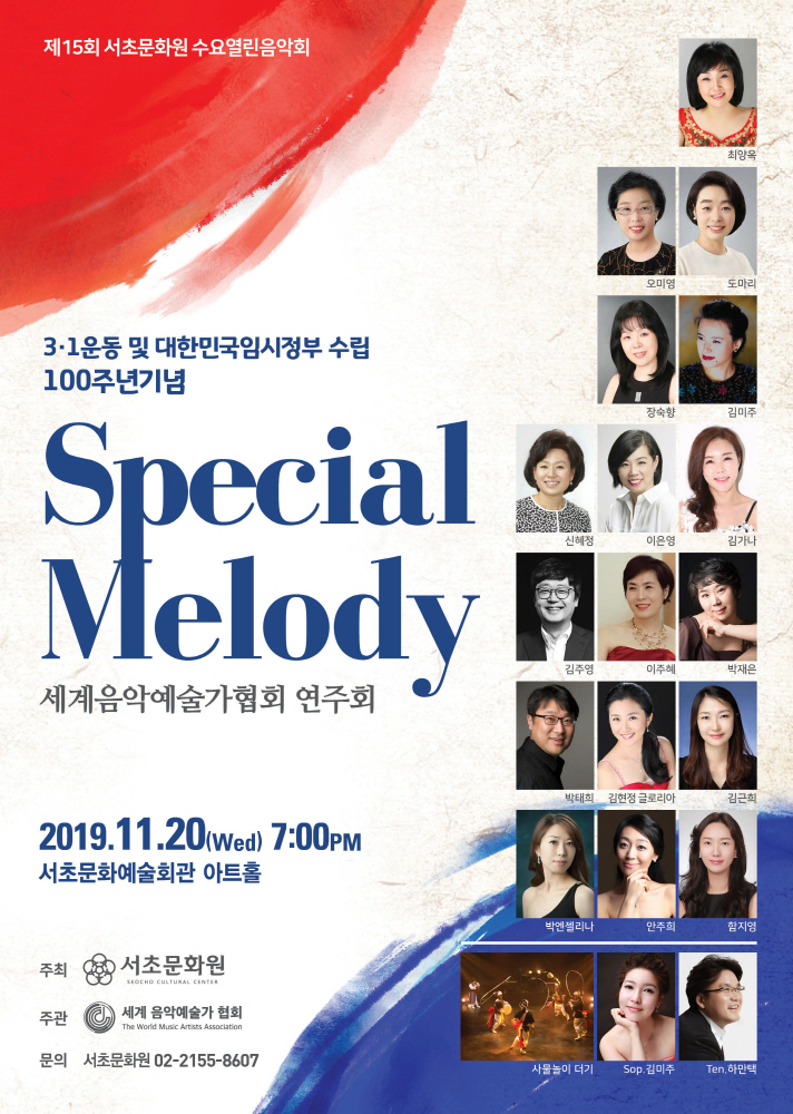 제15회 수요열린음악회 세계음악예술가협회 연주회 <Special Melody> 페이지 정보 작성자 서초문화원 작성일19-11-01 16:21 조회6,782회 댓글0건 관련링크 이전글 다음글 목록 본문 행사명 제15회 수요열린음악회 세계음악예술가협회 연주회 일시 2019년 11월 20일(수) 19:00 장소 서초문화예술회관 아트홀 공연정보 언론보도 이전글 다음글 목록
