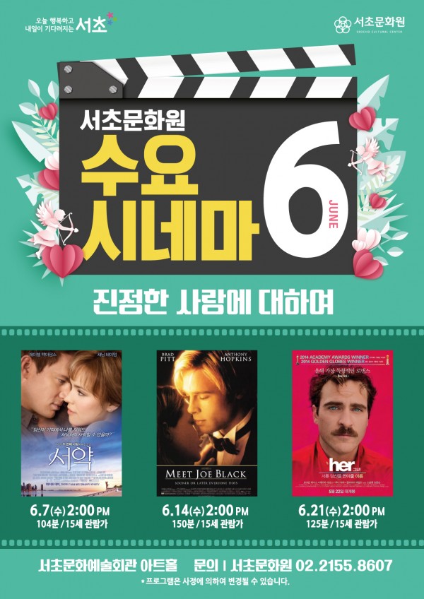 2023.6월 수요시네마 '진정한 사랑에 대하여' 페이지 정보 작성자 서초문화원 작성일23-06-05 13:25 조회3,918회 댓글0건 관련링크 이전글 다음글 목록 본문 행사명 2023.6월 수요시네마 '진정한 사랑에 대하여' 일시 6월 매주 수요일 장소 서초문화예술회관 아트홀 공연정보 [서초문화원 / 6월 수요시네마 안내] 언론보도 - 이전글 다음글 목록