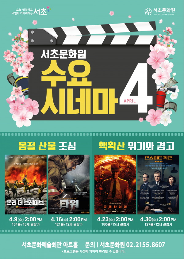 2025년 4월 수요시네마 '봄철 산불 조심&핵확산 위기와 경고' 페이지 정보 작성자 서초문화원 작성일25-04-08 14:25 조회1,758회 댓글0건 관련링크 이전글 다음글 목록 본문 행사명 2025년 4월 수요시네마 '봄철 산불 조심&핵확산 위기와 경고' 일시 4월 9일, 16일, 23일, 30일 / 매주 수요일 / 14시 (총 4회) 장소 서초문화예술회관 아트홀 공연정보 2025년 서초문화원의 무료영화상영 수요시네마 언론보도 - 이전글 다음글 목록