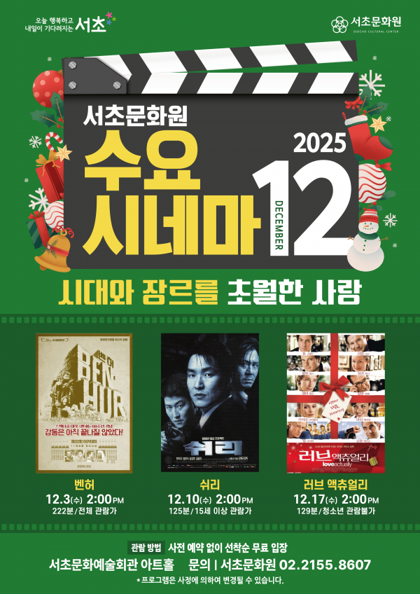 2025년 12월 수요시네마 '시대와 장르를 초월한 사랑' 페이지 정보 작성자 서초문화원 작성일25-11-25 17:08 조회561회 댓글0건 관련링크 이전글 다음글 목록 본문 행사명 2025년 12월 수요시네마 '시대와 장르를 초월한 사랑' 일시 12월 3일, 10일, 17일 14:00 / 매주 수요일 (총 3회) 장소 서초문화예술회관 1층 아트홀(서울시 서초구 강남대로 201) 공연정보 2025년 서초문화원의 무료영화상영 수요시네마 언론보도 사전 예약 없이 선착순 무료 입장 이전글 다음글 목록