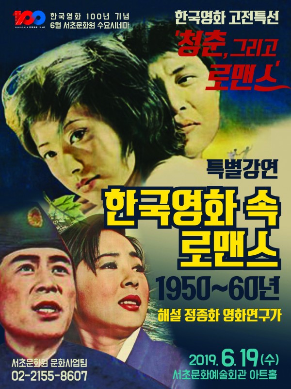 2019.6.19수요시네마 64회<한국영화 속 로맨스> 페이지 정보 작성자 최고관리자 작성일19-05-27 17:50 조회7,873회 댓글0건 관련링크 이전글 다음글 목록 본문 행사명 2019.6.19수요시네마 64회<한국영화 속 로맨스> 일시 2019.6.19(수) 오후3시 장소 서초문화예술회관 아트홀 공연정보 한국영화 100년 기념 한국영화고전특선<한국영화 속 로맨스 1950~60년>· 출연 : 정종화 영화연구가· 러닝타임 : 120분· 등급 : 전체 관람가· 줄거리 : 정종화 영화연구가의 해설로 진행되는 1950년~60년대의 한국영화 속 로맨스에 언론보도 . 이전글 다음글 목록