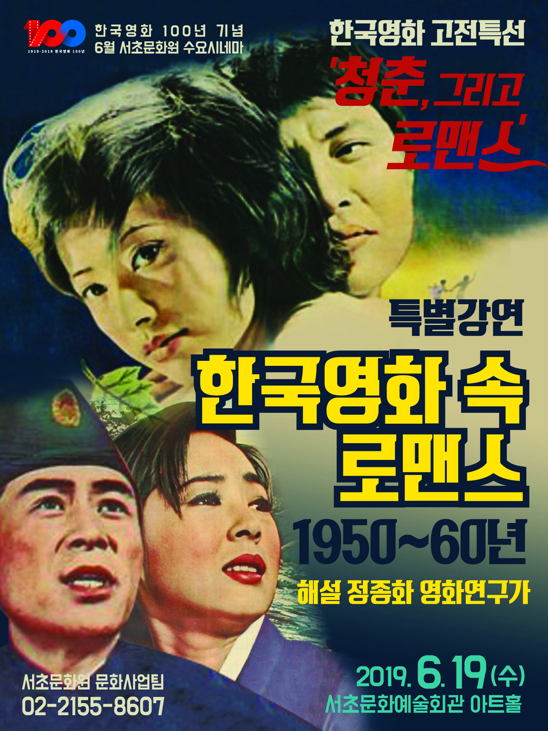 2019.6.19수요시네마 64회<한국영화 속 로맨스> 페이지 정보 작성자 최고관리자 작성일19-05-27 17:50 조회7,866회 댓글0건 관련링크 이전글 다음글 목록 본문 행사명 2019.6.19수요시네마 64회<한국영화 속 로맨스> 일시 2019.6.19(수) 오후3시 장소 서초문화예술회관 아트홀 공연정보 한국영화 100년 기념 한국영화고전특선<한국영화 속 로맨스 1950~60년>· 출연 : 정종화 영화연구가· 러닝타임 : 120분· 등급 : 전체 관람가· 줄거리 : 정종화 영화연구가의 해설로 진행되는 1950년~60년대의 한국영화 속 로맨스에 언론보도 . 이전글 다음글 목록