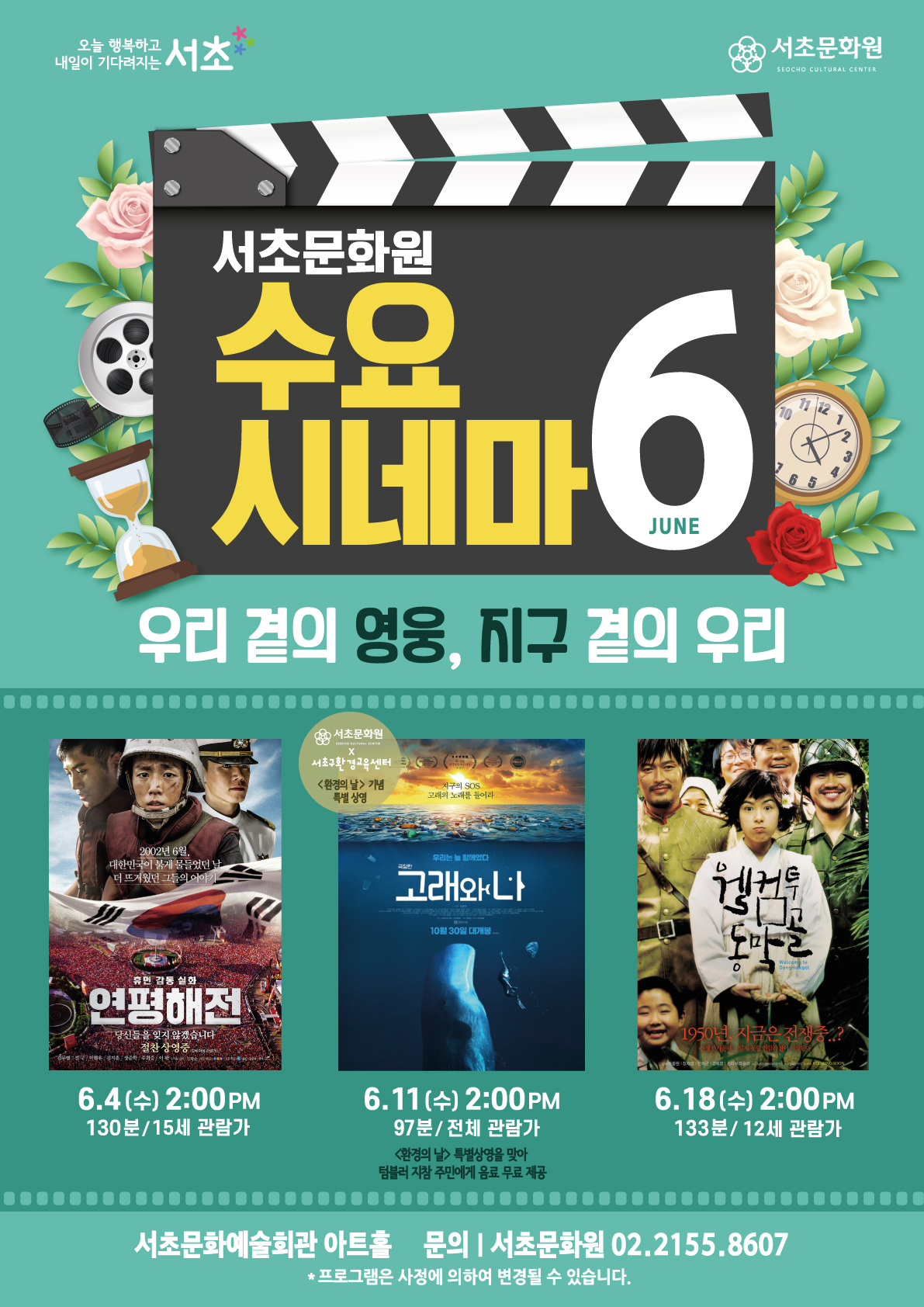 2025년 6월 수요시네마 '우리 곁의 영웅, 지구 곁의 우리' 페이지 정보 작성자 서초문화원 작성일25-05-28 15:46 조회1,439회 댓글0건 관련링크 이전글 다음글 목록 본문 행사명 2025년 6월 수요시네마 '우리 곁의 영웅, 지구 곁의 우리' 일시 6월 4일, 11일, 18일 14:00 / 매주 수요일 (총 3회) 장소 서초문화예술회관 1층 아트홀(서울시 서초구 강남대로 201) 공연정보 2025년 서초문화원의 무료영화상영 수요시네마 언론보도 - 이전글 다음글 목록