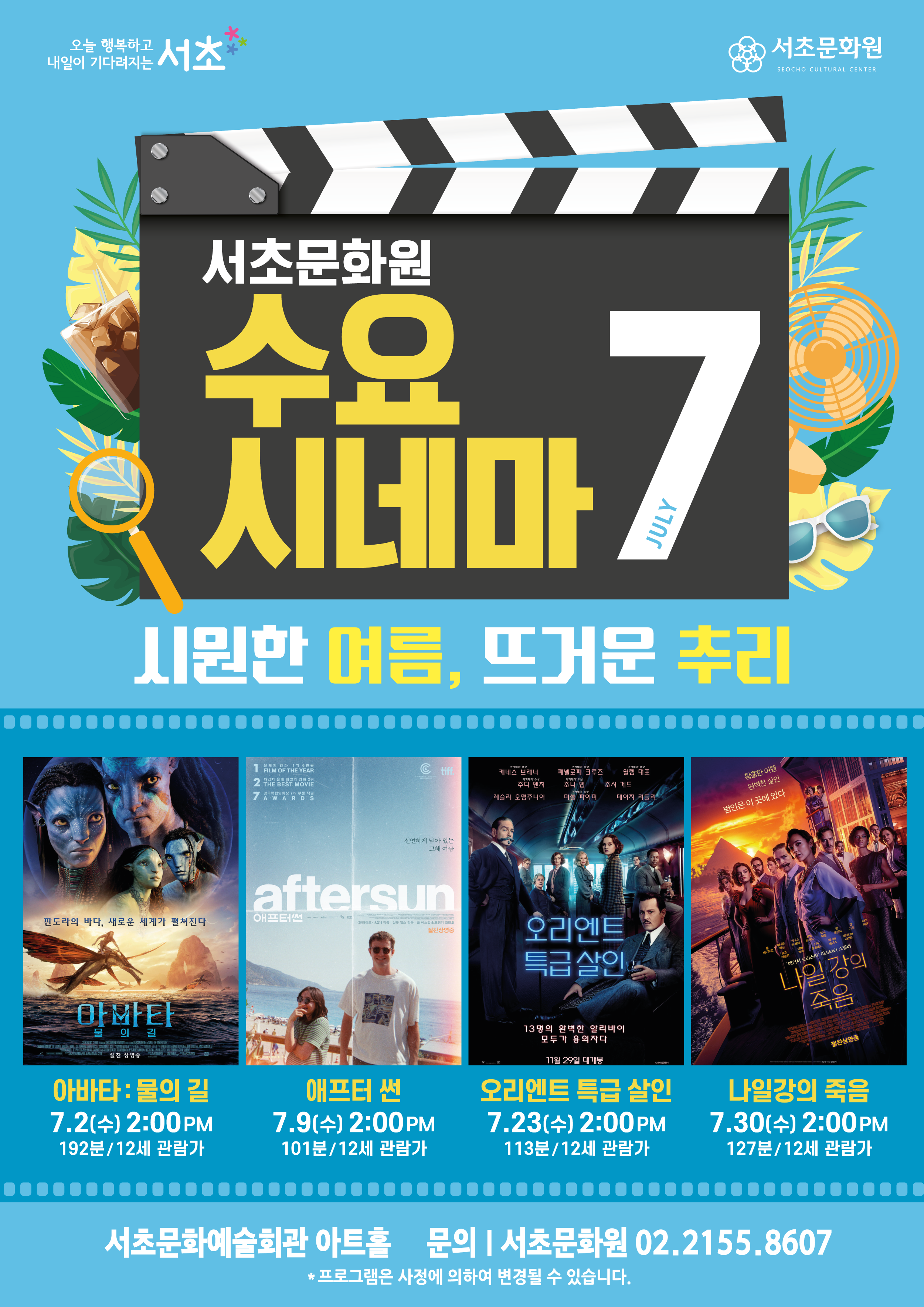 2025년 7월 수요시네마 '시원한 여름, 뜨거운 추리' 페이지 정보 작성자 서초문화원 작성일25-06-19 13:26 조회1,225회 댓글0건 관련링크 이전글 다음글 목록 본문 행사명 2025년 7월 수요시네마 '시원한 여름, 뜨거운 추리' 일시 7월 2일, 9일, 23일, 30일 14:00 / 매주 수요일 (총 4회) 장소 서초문화예술회관 1층 아트홀(서울시 서초구 강남대로 201) 공연정보 2025년 서초문화원의 무료영화상영 수요시네마 언론보도 ※7월 16일 (수) 수요시네마는 아트홀 사정에 의해 진행하지 않습니다. 이전글 다음글 목록