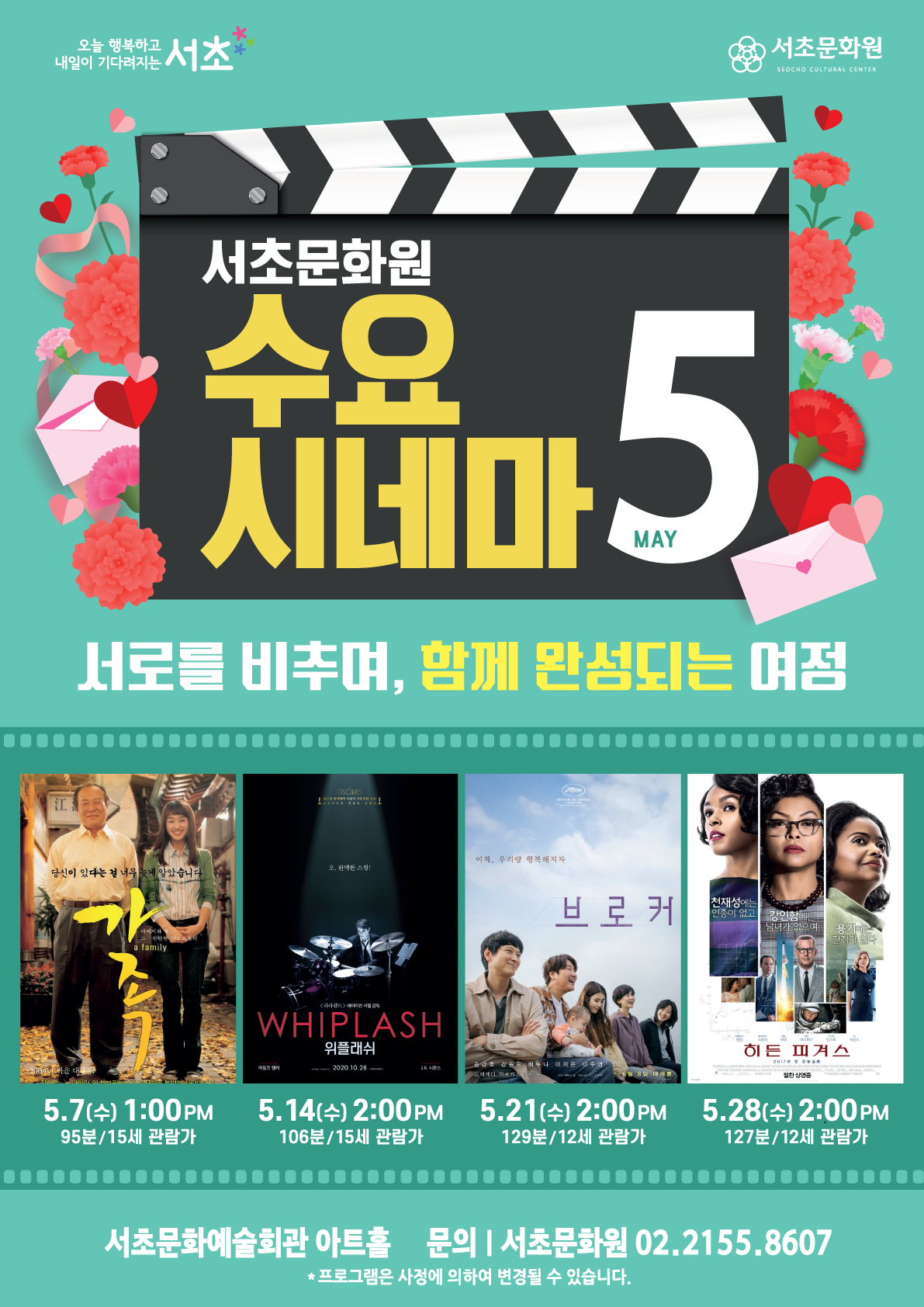 2025년 5월 수요시네마 '서로를 비추며, 함께 완성되는 여정' 페이지 정보 작성자 서초문화원 작성일25-04-24 16:19 조회1,647회 댓글0건 관련링크 이전글 다음글 목록 본문 행사명 2025년 5월 수요시네마 '서로를 비추며, 함께 완성되는 여정' 일시 5월 7일 13:00 / 5월 14일, 21일, 28일 14:00 / 매주 수요일(총 4회) 장소 서초문화예술회관 아트홀 공연정보 2025년 서초문화원의 무료영화상영 수요시네마 언론보도 - 이전글 다음글 목록
