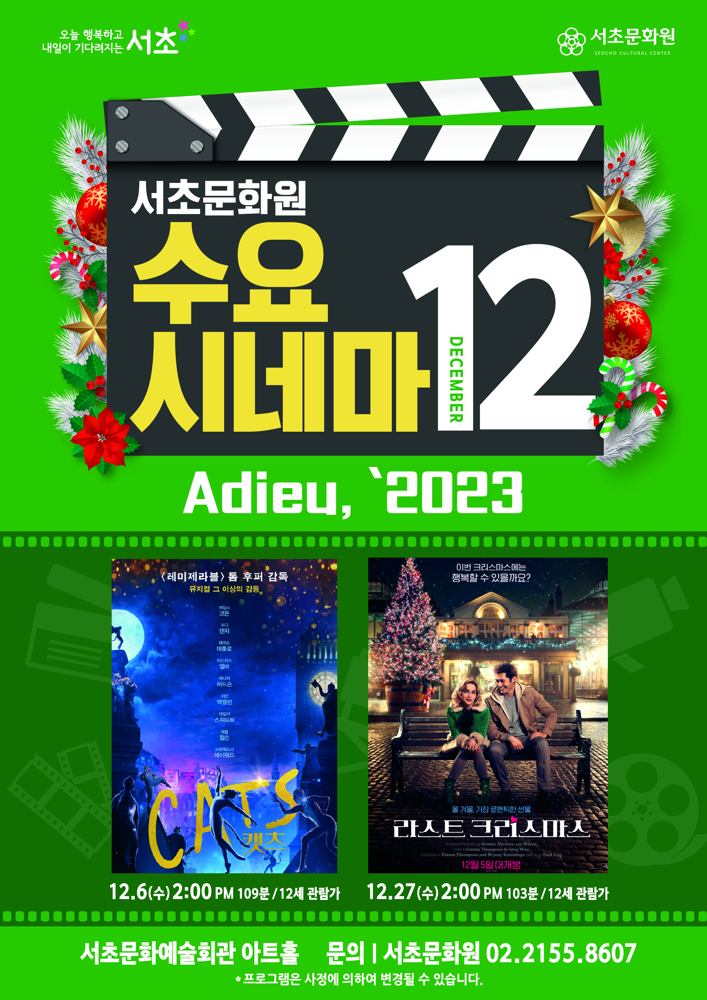 2023년 12월 수요시네마 'Adieu, '2023' 페이지 정보 작성자 서초문화원 작성일23-12-01 15:13 조회3,566회 댓글0건 관련링크 이전글 다음글 목록 본문 행사명 2023년 12월 수요시네마 'Adieu, '2023' 일시 12월 6일 (수) , 12월 27일 (수) 장소 서초문화예술회관 아트홀 공연정보 2023년의 마지막 달을 보내는 서초문화원의 무료영화상영 수요시네마 언론보도 - 이전글 다음글 목록