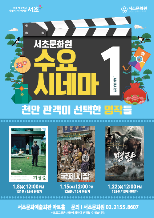 2025년 1월 수요시네마 '천만 관객이 선택한 명작들' 페이지 정보 작성자 서초문화원 작성일24-12-26 18:10 조회2,150회 댓글0건 관련링크 이전글 다음글 목록 본문 행사명 2025년 1월 수요시네마 '천만 관객이 선택한 명작들' 일시 1월 8일 (수) 12시, 1월 15일 (수) 12시, 1월 22일 (수) 12시 장소 서초문화예술회관 아트홀 공연정보 2025년 서초문화원의 무료영화상영 수요시네마 언론보도 - 이전글 다음글 목록