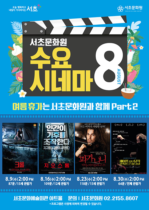 2023.8월 수요시네마 '여름 휴가는 서초문화원과 함께 Part 2' 페이지 정보 작성자 서초문화원 작성일23-07-27 16:46 조회3,944회 댓글0건 관련링크 이전글 다음글 목록 본문 행사명 2023.8월 수요시네마 '여름 휴가는 서초문화원과 함께 Part 2' 일시 8월 첫째 주 제외 매주 수요일 장소 서초문화예술회관 아트홀 공연정보 [서초문화원 / 8월 수요시네마 안내] 언론보도 - 이전글 다음글 목록