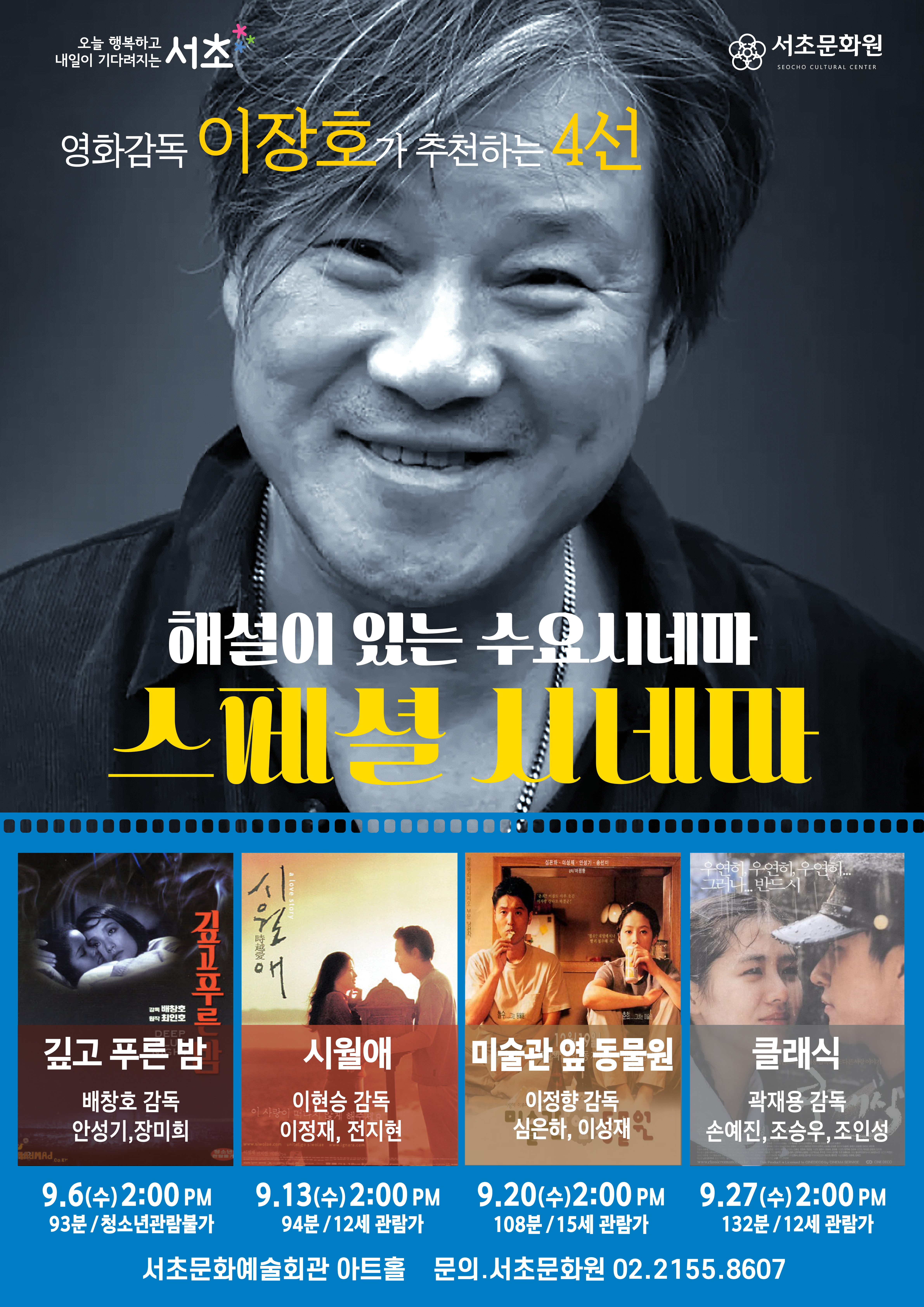 2023.9월 해설이 있는 수요시네마 [스페셜시네마]'영화감독 이장호가 추천하는 4선' 페이지 정보 작성자 서초문화원 작성일23-08-25 15:52 조회3,996회 댓글0건 관련링크 이전글 다음글 목록 본문 행사명 2023.9월 해설이 있는 수요시네마 [스페셜시네마]'영화감독 이장호가 추천하는 4선' 일시 9월 매주 수요일 장소 서초문화예술회관 아트홀 공연정보 [서초문화원 / 9월 수요시네마(스페셜시네마) 안내] 9월의 수요시네마는 영화감독 이장호 감독님께서 직접 엄선한 영화로 편성되었습니다.이장호 감독님의 생생한 영화해설과 함께하는 9월의 수요시네마!&l 언론보도 - 이전글 다음글 목록