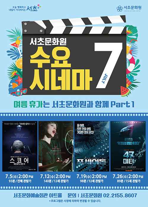 2023.7월 수요시네마 '여름 휴가는 서초문화원과 함께 Part 1' 페이지 정보 작성자 서초문화원 작성일23-07-03 10:37 조회3,781회 댓글0건 관련링크 이전글 다음글 목록 본문 행사명 2023.7월 수요시네마 '여름 휴가는 서초문화원과 함께 Part 1' 일시 7월 매주 수요일 장소 서초문화예술회관 아트홀 공연정보 [서초문화원 / 7월 수요시네마 안내] 언론보도 - 이전글 다음글 목록