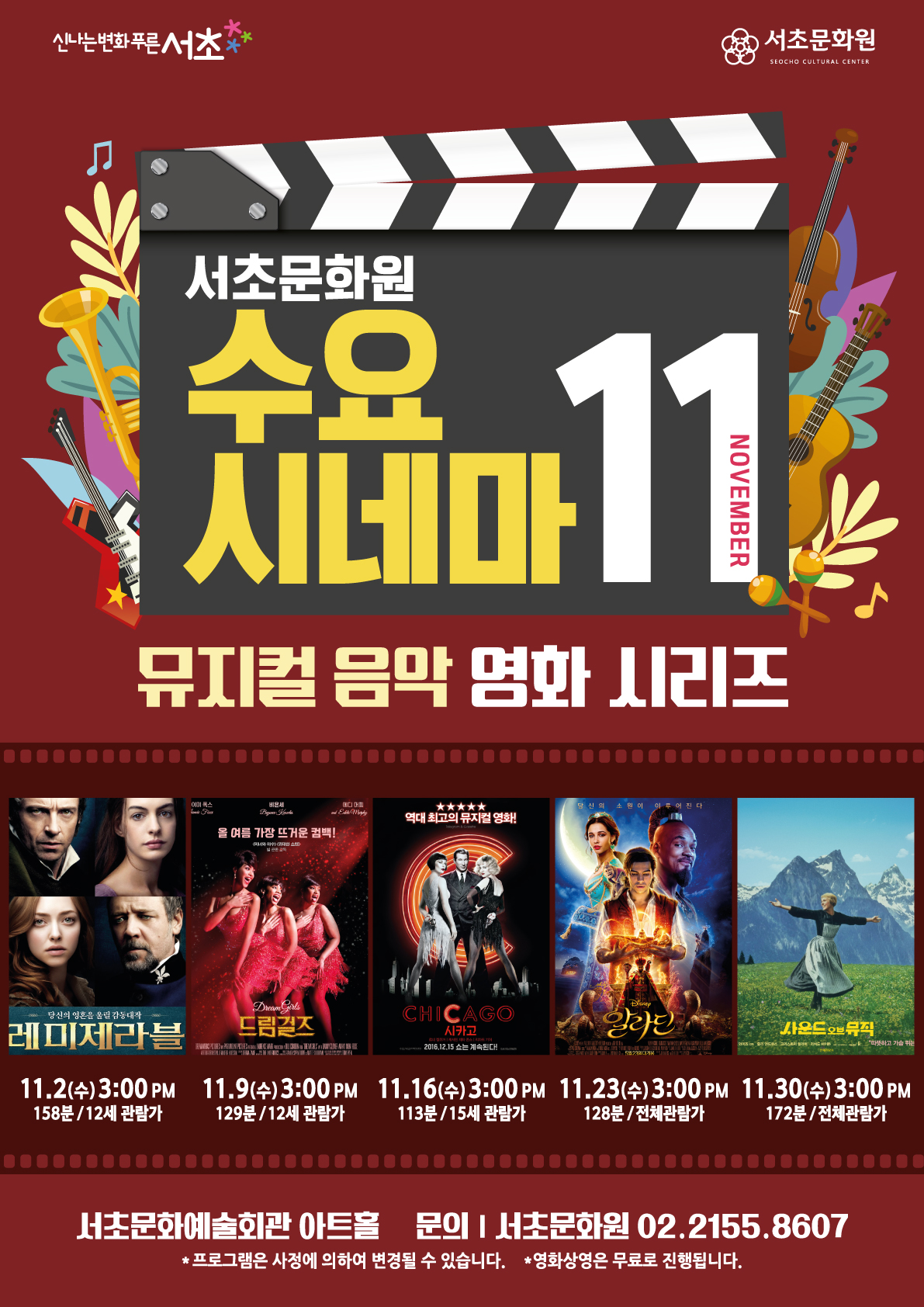 2022.11월 수요시네마 '뮤지컬 음악 영화 시리즈' 페이지 정보 작성자 서초문화원 작성일22-10-20 11:55 조회4,414회 댓글0건 관련링크 이전글 다음글 목록 본문 행사명 2022.11월 수요시네마 '뮤지컬 음악 영화 시리즈' 일시 2022.11 장소 서초문화예술회관 아트홀 공연정보 언론보도 이전글 다음글 목록