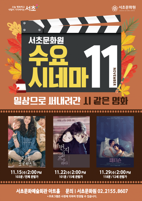 2023년 11월 수요시네마 '일상으로 써내려간 시 같은 영화' 페이지 정보 작성자 서초문화원 작성일23-10-27 13:20 조회3,740회 댓글0건 관련링크 이전글 다음글 목록 본문 행사명 2023년 11월 수요시네마 '일상으로 써내려간 시 같은 영화' 일시 11월 15일 (수) ~ 11월 29일 (수) 장소 서초문화예술회관 아트홀 공연정보 - 언론보도 - 이전글 다음글 목록