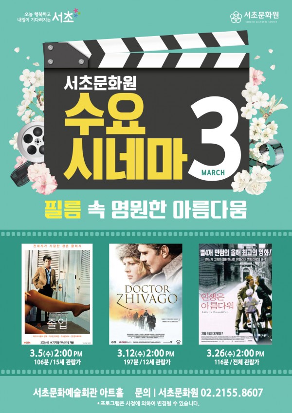 2025년 3월 수요시네마 '필름 속 영원한 아름다움' 페이지 정보 작성자 서초문화원 작성일25-03-05 10:34 조회1,908회 댓글0건 관련링크 이전글 다음글 목록 본문 행사명 2025년 3월 수요시네마 '필름 속 영원한 아름다움' 일시 3월 5일 (수) 14시, 3월 12일 (수) 14시, 3월 26일 14시 장소 서초문화예술회관 아트홀 공연정보 2025년 서초문화원의 무료영화상영 수요시네마 언론보도 - 이전글 다음글 목록