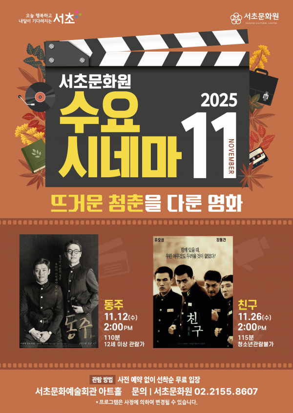 2025년 11월 수요시네마 '뜨거운 청춘을 다룬 영화' 페이지 정보 작성자 서초문화원 작성일25-10-21 15:51 조회616회 댓글0건 관련링크 이전글 다음글 목록 본문 행사명 2025년 11월 수요시네마 '뜨거운 청춘을 다룬 영화' 일시 11월 12일, 26일 14:00 / 매주 수요일 (총 2회) 장소 서초문화예술회관 1층 아트홀(서울시 서초구 강남대로 201) 공연정보 2025년 서초문화원의 무료영화상영 수요시네마 언론보도 사전 예약 없이 선착순 무료 입장 이전글 다음글 목록