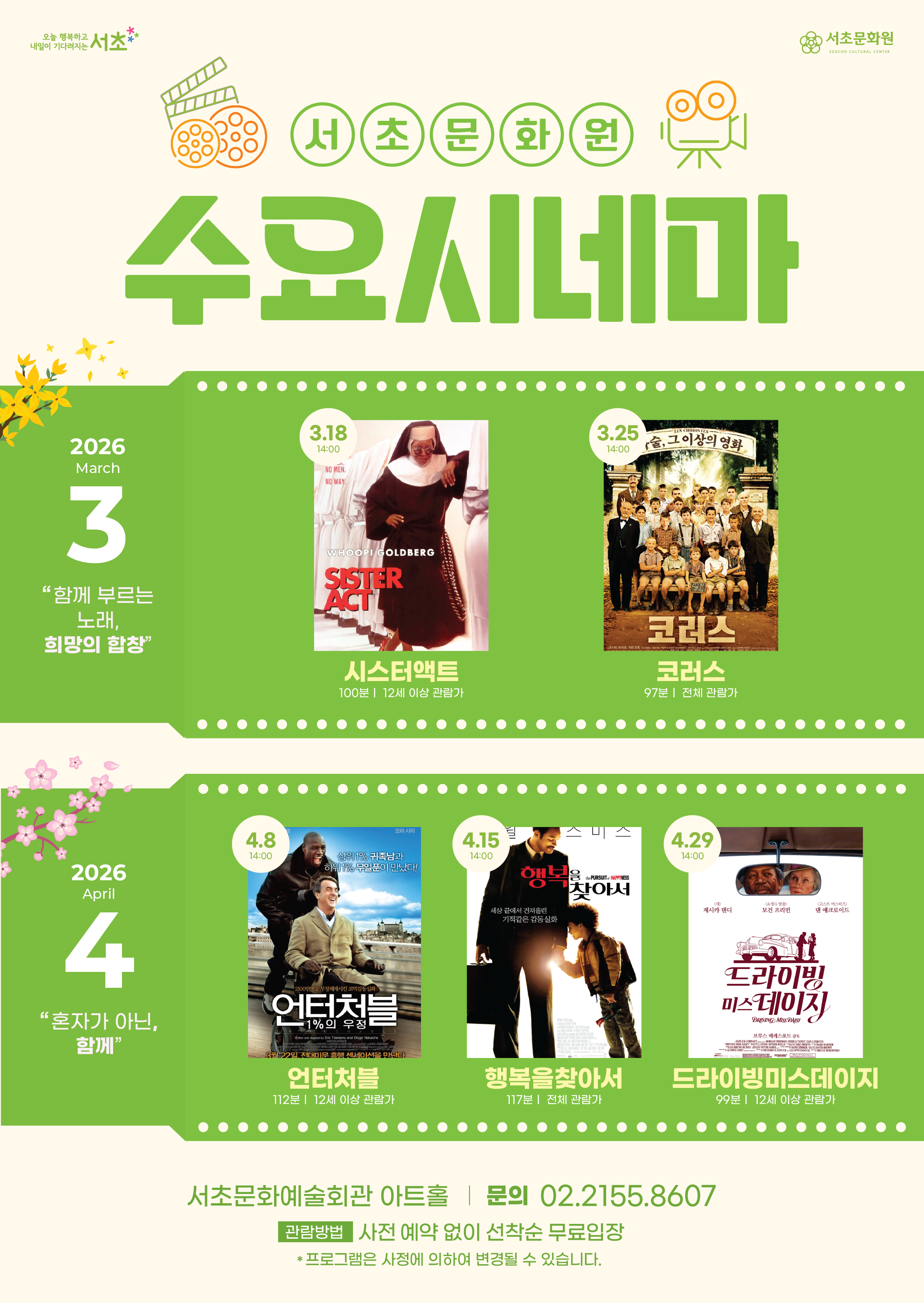 2026년 3-4월 수요시네마 '함께 부르는 노래, 희망의 합창' 페이지 정보 작성자 서초문화원 작성일26-02-24 16:43 조회202회 댓글0건 관련링크 이전글 다음글 목록 본문 행사명 2026년 3-4월 수요시네마 '함께 부르는 노래, 희망의 합창' 일시 3월 18일, 25일 14:00 / 매주 수요일 (총2회) / 4월 8일 15일 29일 14:00 / 매주 수요일 (총3회) 장소 서초문화예술회관 1층 아트홀 (서울시 서초구 강남대로 201) 공연정보 2026년 서초문화원의 무료영화상영 수요시네마 언론보도 사전 예약 없이 선착순 무료 입장 이전글 다음글 목록