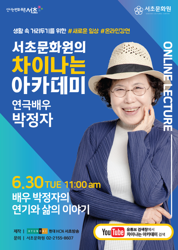 2020년 6월 서초문화원의 차이나는 아카데미 - 연극배우 박정자 페이지 정보 작성자 서초문화원 작성일21-05-25 13:44 조회3,893회 댓글0건 관련링크 이전글 다음글 목록 본문 행사명 2020년 6월 서초문화원의 차이나는 아카데미 - 연극배우 박정자 일시 6월 30일(화) 오전 11시 장소 (온라인) 서초문화원 공식 유튜브 공연정보 6월 30일(화) 오전 11시연극배우 박정자배우 박정자의 연기와 삶의 이야기방송다시보기 : 서초문화원 공식 유튜브 언론보도 이전글 다음글 목록