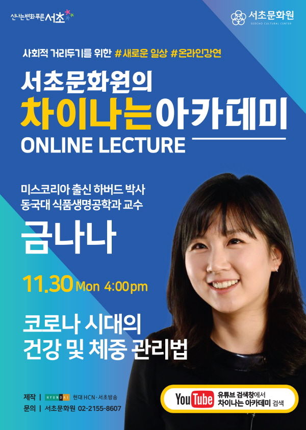 2020년 11월 서초문화원의 차이나는 아카데미 - 금나나 교수 페이지 정보 작성자 서초문화원 작성일21-05-25 13:54 조회4,005회 댓글0건 관련링크 이전글 다음글 목록 본문 행사명 2020년 11월 서초문화원의 차이나는 아카데미 - 금나나 교수 일시 11월 30일(월) 오후 4시 장소 (온라인) 서초문화원 공식 유튜브 공연정보 11월 30일(월) 오후 4시미스코리아 출신 하버드 박사동국대 식품생명공학과 교수 코로나 시대의 건강 및 체중 관리법방송다시보기 : 서초문화원 공식 유튜브 언론보도 이전글 다음글 목록