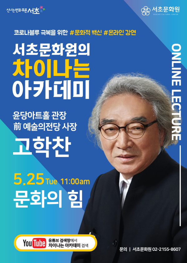 2021년 5월 서초문화원의 차이나는 아카데미 - 고학찬 전 예술의전당 사장 페이지 정보 작성자 서초문화원 작성일21-05-25 13:57 조회4,659회 댓글0건 관련링크 이전글 다음글 목록 본문 행사명 2021년 5월 서초문화원의 차이나는 아카데미 - 고학찬 전 예술의전당 사장 일시 5월 25일(화) 오전 11시 장소 (온라인) 서초문화원 공식 유튜브 공연정보 5월 25일(화) 오전 11시고학찬 전 예술의전당 사장문화의 힘 "소통과 화합은 문화의 힘으로 근본적인 해답을 얻을 수 있다"방송다시보기 : 서초문화원 공식 유튜브 언론보도 이전글 다음글 목록