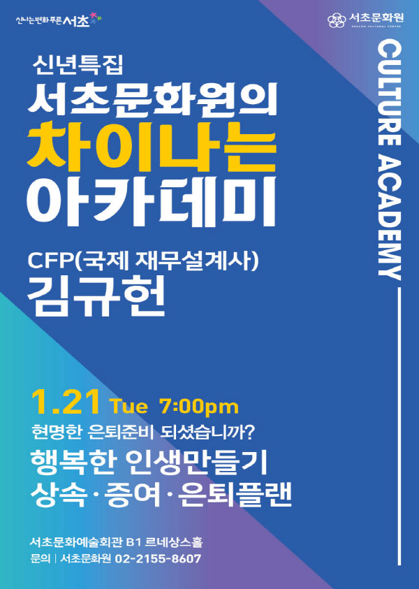 2020년 1월 서초문화원의 차이나는 아카데미 - 국제 재무설계사 김규헌 페이지 정보 작성자 서초문화원 작성일21-05-25 13:32 조회3,160회 댓글0건 관련링크 이전글 다음글 목록 본문 행사명 2020년 1월 서초문화원의 차이나는 아카데미 - 국제 재무설계사 김규헌 일시 1월 21일 오후 7시 장소 (방송) 현대HCN서초방송 / (온라인) 서초문화원 공식 유튜브 공연정보 1월 21일(화) 오후 7시현명한 은퇴준비 되셨습니까?행복한 인생만들기상속/증여/은퇴플랜서초문화예술회관 B1르네상스홀 언론보도 이전글 다음글 목록