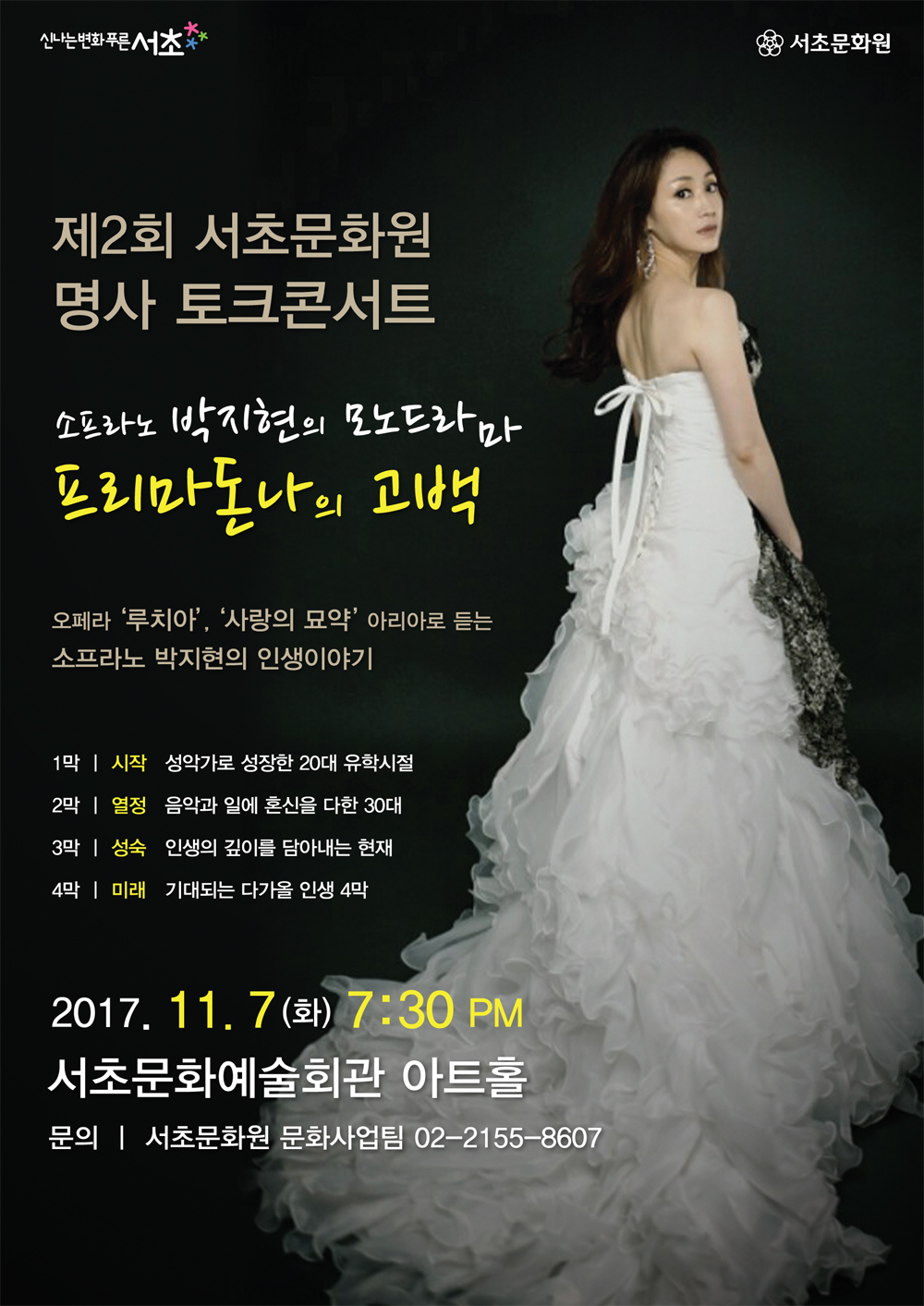 제2회 명사토크콘서트 <소프라노 박지현, 프리마돈나의 고백> 페이지 정보 작성자 최고관리자 작성일17-12-19 21:25 조회3,969회 댓글0건 관련링크 이전글 다음글 목록 본문 행사명 제2회 명사토크콘서트 <소프라노 박지현, 프리마돈나의 고백> 일시 2017년 11월 25일(수) 19:30 장소 서초문화예술회관 아트홀 공연정보 <소프라노 박지현의 모노드라마, '프리마돈나의 고백'>그녀의 인생 희노애락을 오페라에 비유해서 주옥같은 아리아와 가곡을 통해 이야기를 나눈다.성악가로 성장한 '인생 1막'부터 열정의 프리마돈나가 된 '인생 2막', 성숙미가 느껴지는 '인생 3막', 다가올 미래 '인생 4막'까지! 오페라 <루치아>, <사랑의 묘약>의 아리아와 함께 감상한다. 언론보도 . 이전글 다음글 목록