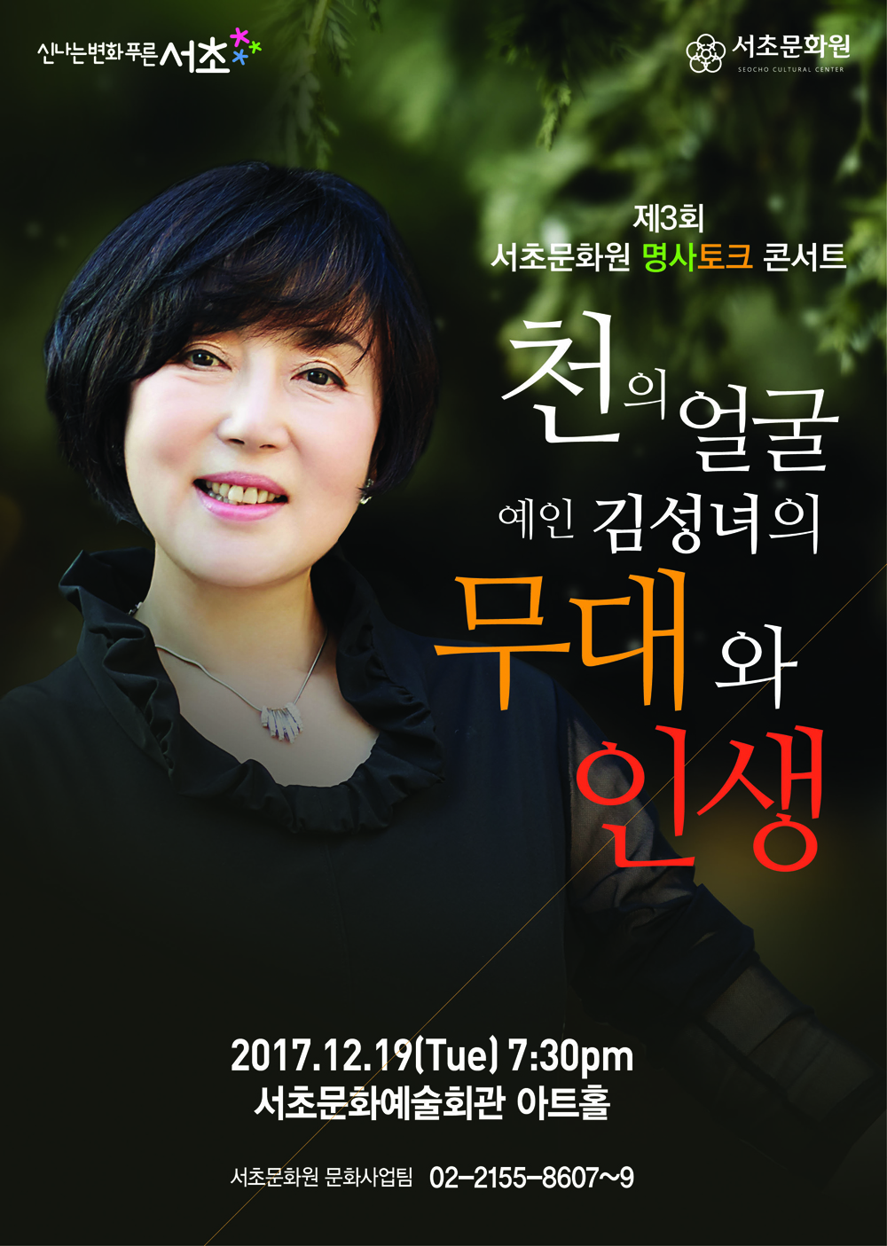 제3회 명사토크톤서트 <예인 김성녀의 무대와 인생> 페이지 정보 작성자 최고관리자 작성일18-01-19 16:13 조회3,955회 댓글0건 관련링크 이전글 다음글 목록 본문 행사명 제3회 명사토크톤서트 <예인 김성녀의 무대와 인생> 일시 2017년 12월 19일(수) 19:30 장소 서초문화예술회관 아트홀 공연정보 <천의 얼굴, 예인 김성녀의 무대와 인생>다양한 예술 장르를 섭렵한 예인의 인생을 '1막 마당놀이', '2막 연극과 뮤지컬', '3막 창극', '4막 악극'으로 구성하여, 그녀의 인생스토리가 담긴 아름다운 무대를 감상한다. 언론보도 이전글 다음글 목록