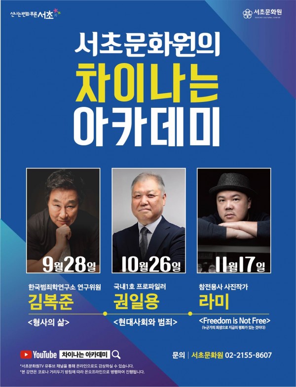 2021년 9월~11월 서초문화원의 차이나는 아카데미 - 김복준, 권일용, 라미 페이지 정보 작성자 서초문화원 작성일21-09-30 10:39 조회4,977회 댓글0건 관련링크 이전글 다음글 목록 본문 행사명 2021년 9월~11월 서초문화원의 차이나는 아카데미 - 김복준, 권일용, 라미 일시 9월 28일(화)|10월 26일(화)|11월 17일(수) 장소 (온라인) 서초문화원 공식 유튜브 or 서초문화예술회관 B1 르네상스홀 공연정보 - 한국범죄학 연구소 연구위원 김복준 <형사의 삶>- 국내1호 프로파일러 권일용 <현대사회와 범죄>- 참전용사 사진작가 라미 (누군가의 희생으로 지금의 평화가 있는 것이다) 언론보도 ⠀⠀ 이전글 다음글 목록