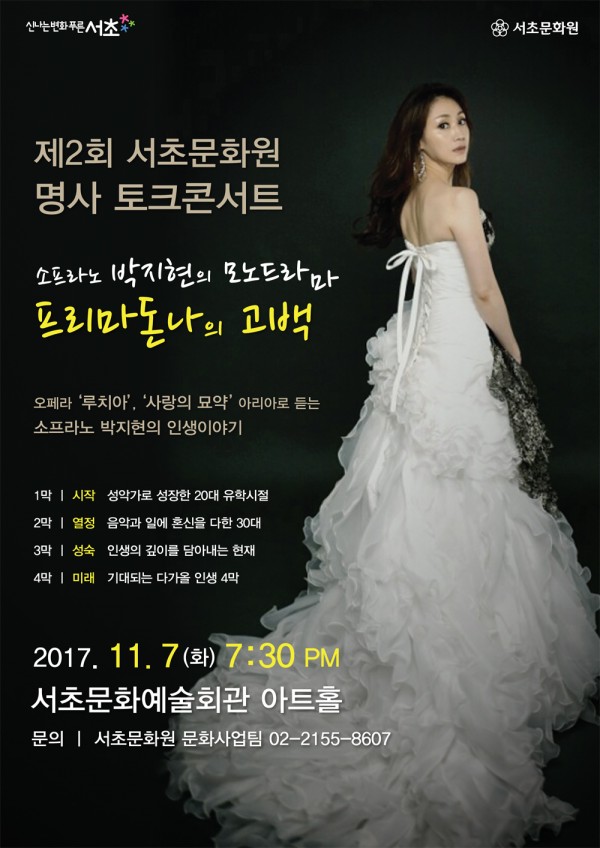 제2회 명사토크콘서트 <소프라노 박지현, 프리마돈나의 고백> 페이지 정보 작성자 최고관리자 작성일17-12-19 21:25 조회3,972회 댓글0건 관련링크 이전글 다음글 목록 본문 행사명 제2회 명사토크콘서트 <소프라노 박지현, 프리마돈나의 고백> 일시 2017년 11월 25일(수) 19:30 장소 서초문화예술회관 아트홀 공연정보 <소프라노 박지현의 모노드라마, '프리마돈나의 고백'>그녀의 인생 희노애락을 오페라에 비유해서 주옥같은 아리아와 가곡을 통해 이야기를 나눈다.성악가로 성장한 '인생 1막'부터 열정의 프리마돈나가 된 '인생 2막', 성숙미가 느껴지는 '인생 3막', 다가올 미래 '인생 4막'까지! 오페라 <루치아>, <사랑의 묘약>의 아리아와 함께 감상한다. 언론보도 . 이전글 다음글 목록