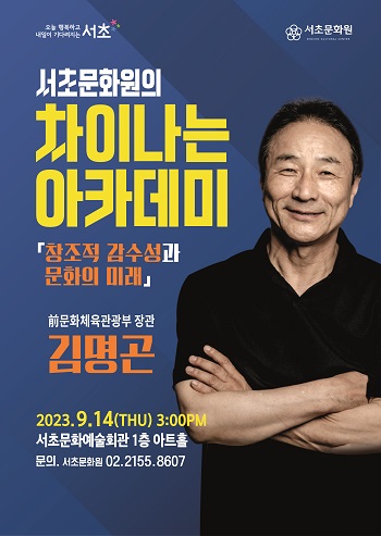 2023년 9월 서초문화원의 차이나는 아카데미 - 前 문화체육관광부 장관 '김명곤' 페이지 정보 작성자 서초문화원 작성일23-09-19 09:39 조회3,133회 댓글0건 관련링크 이전글 다음글 목록 본문 행사명 2023년 9월 서초문화원의 차이나는 아카데미 - 前 문화체육관광부 장관 '김명곤' 일시 2023년 9월 14일 (목) 15:00 장소 서초문화예술회관 1층 아트홀 공연정보 '창조적 감수성과 문화의 미래' 언론보도 - 이전글 다음글 목록