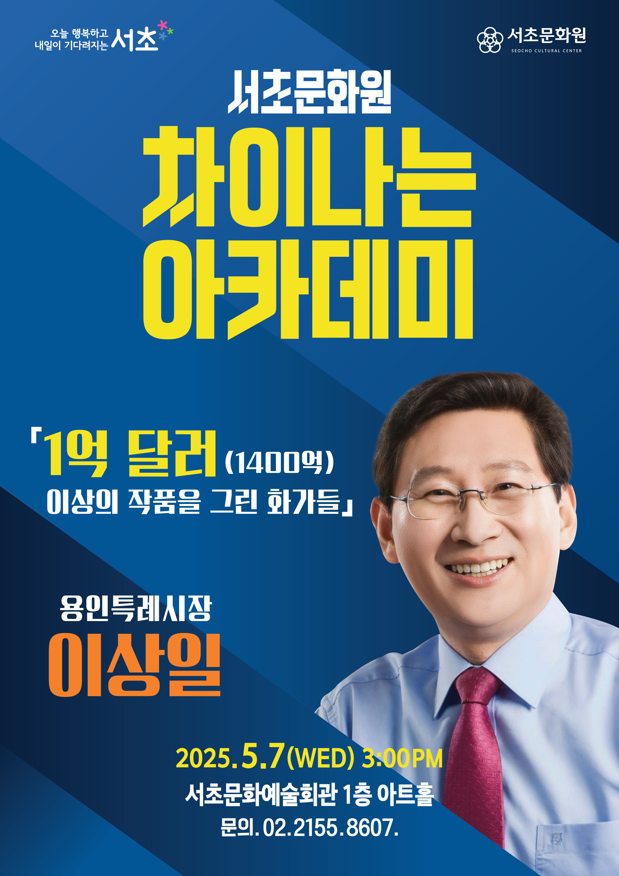 2025년 서초문화원 차이나는 아카데미 - '용인특례시장' 이상일 페이지 정보 작성자 서초문화원 작성일25-05-21 10:32 조회1,154회 댓글0건 관련링크 이전글 다음글 목록 본문 행사명 2025년 서초문화원 차이나는 아카데미 - '용인특례시장' 이상일 일시 2025년 5월 7일 (수) 15:00 장소 서초문화예술회관 1층 아트홀 공연정보 『1억 달러(1400억) 이상의 작품을 그린 화가들』 언론보도 - 이전글 다음글 목록