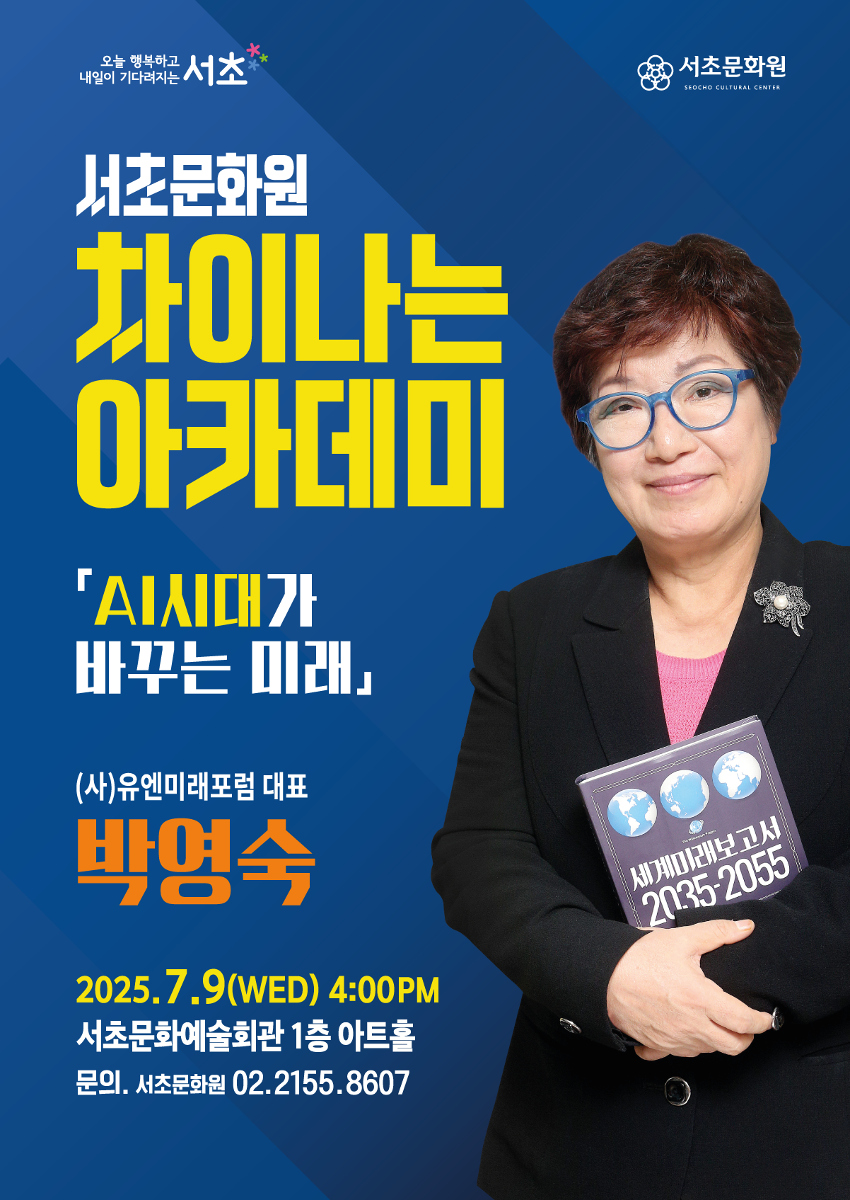 2025년 서초문화원 차이나는 아카데미 - '(사)유엔미래포럼 대표' 박영숙 페이지 정보 작성자 서초문화원 작성일25-07-01 11:19 조회842회 댓글0건 관련링크 이전글 다음글 목록 본문 행사명 2025년 서초문화원 차이나는 아카데미 - '(사)유엔미래포럼 대표' 박영숙 일시 2025년 7월 9일 (수) 16:00 장소 서초문화예술회관 1층 아트홀 공연정보 [차이나는 아카데미] AI시대가 바꾸는 미래 언론보도 특별 관람 이벤트강연 종료 후, 현장 추첨을 통해 소정의 상품을 드립니다! ※ 사전예약하신 분들도 비지정석으로 선착순 착석하오니 양해 부탁드립니다.※ 주차비 지원이 불가하오니 대중교통 이용을 권장드립니다.문의: 서초문화원 02-2155-8607 이전글 다음글 목록