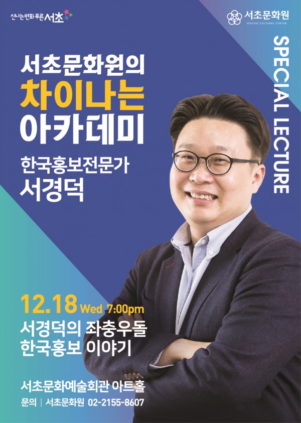 2019년 12월 서초문화원의 차이나는 아카데미 - 한국홍보전문가 서경덕 페이지 정보 작성자 서초문화원 작성일20-01-02 11:37 조회3,407회 댓글0건 관련링크 이전글 다음글 목록 본문 행사명 2019년 12월 서초문화원의 차이나는 아카데미 - 한국홍보전문가 서경덕 일시 2019년 12월 18일(수) 19:00 장소 서초문화예술회관 아트홀 공연정보 좌충우돌 한국 홍보 이야기세계를 향한 무한도전 언론보도 이전글 다음글 목록