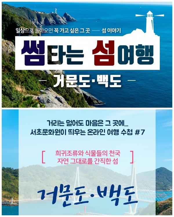 썸타는 섬여행 '거문도·백도' 페이지 정보 작성자 서초문화원 작성일20-11-13 16:48 조회3,521회 댓글0건 관련링크 이전글 다음글 목록 본문 행사명 썸타는 섬여행 '거문도·백도' 일시 서초문화원이 띄우는 온라인 여행수첩 #7 장소 희귀조류와 식물들의 천국, 자연 그대로를 간직한 섬 '거문도·백도' 공연정보 ▶보러가기http://pf.kakao.com/_tprxlT/60093712 언론보도 이전글 다음글 목록