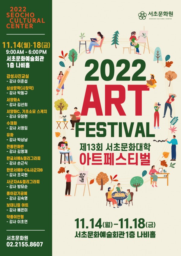 제13회 서초문화대학 아트페스티벌 페이지 정보 작성자 서초문화원 작성일23-01-02 13:54 조회3,186회 댓글0건 관련링크 이전글 다음글 목록 본문 행사명 제13회 서초문화대학 아트페스티벌 일시 2022.11.14.~11.18. 장소 서초문화예술회관 나비홀 공연정보 언론보도 이전글 다음글 목록