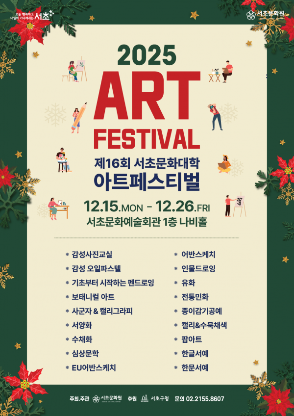 제16회 서초문화대학 아트페스티벌 페이지 정보 작성자 서초문화원 작성일25-12-09 13:33 조회178회 댓글0건 관련링크 다음글 목록 본문 행사명 제16회 서초문화대학 아트페스티벌 일시 1주차 25.12.15.(월) ~ 12.19.(금) / 2주차 25.12.22.(월) ~ 12.26.(금) 장소 서초문화예술회관 1층 나비홀 공연정보 언론보도 다음글 목록