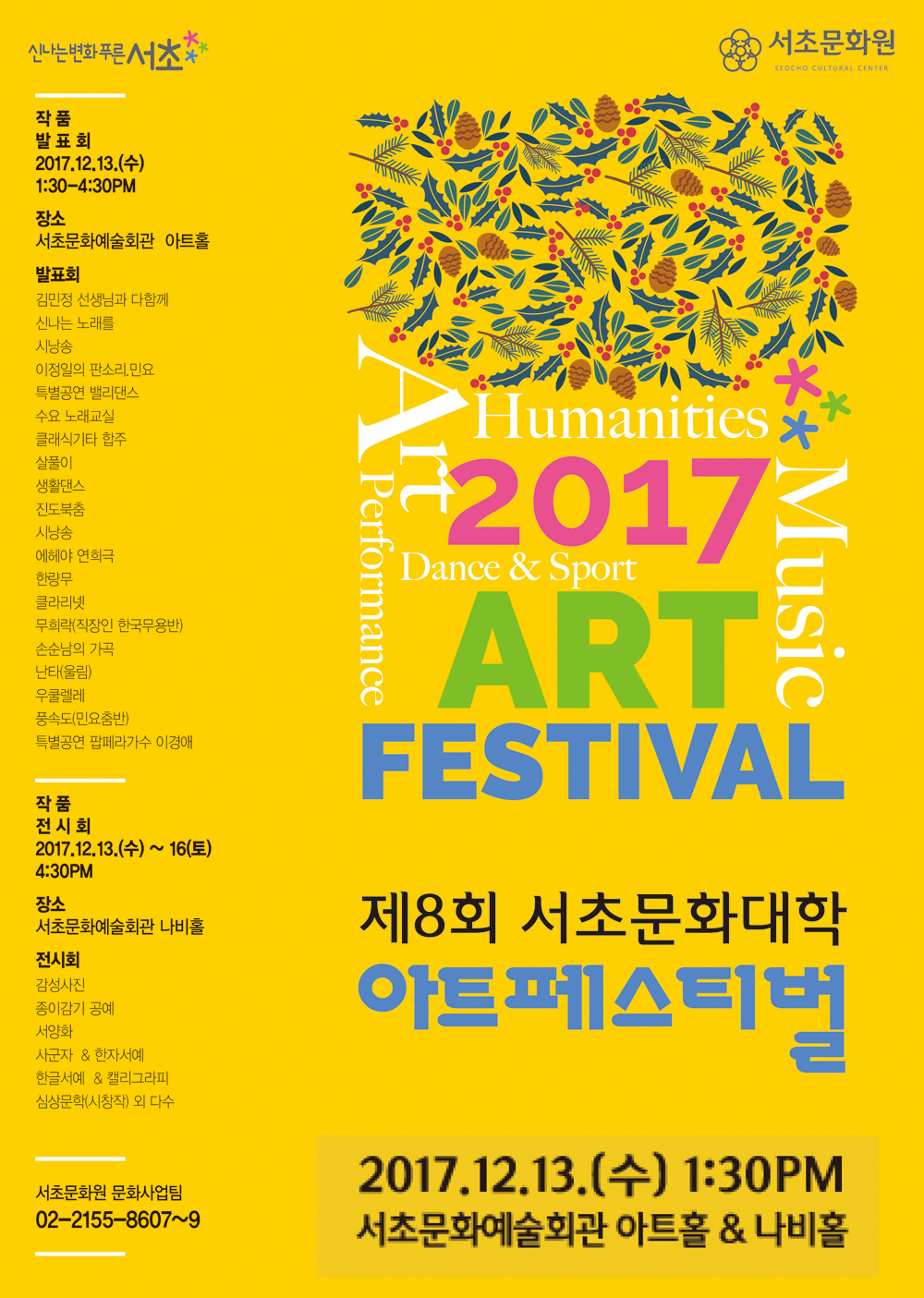 제8회 서초문화대학 아트페스티벌 페이지 정보 작성자 최고관리자 작성일18-01-20 19:09 조회6,072회 댓글0건 관련링크 이전글 목록 본문 행사명 제8회 서초문화대학 아트페스티벌 일시 2017년 12월 13일(수) ~ 16일(토) 장소 서초문화예술회관 아트홀&나비홀 공연정보 1년동안 서초구민 대상으로 이루어진 서초문화대학 문화예술강좌를 통해 갈고 닦은 기량을 발휘하는 무대를 마련하여 구민들의 문화·예술 활동 증진에 기여하는 뜻 깊은 시간을 갖는다.다함께 즐길 수 있는 문화축제의 시간을 가지며, 사진, 서예, 공예 등의 작품전시회는 12월 13일(수) ~ 16(토)까지 서초문화예술회관 나비홀에서 진행된다. 언론보도 이전글 목록