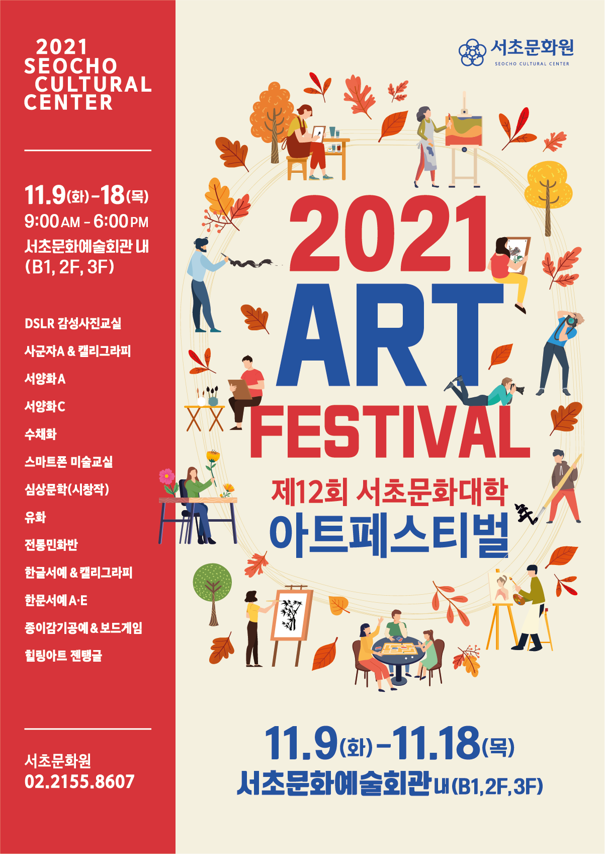 제12회 서초문화대학 아트페스티벌 페이지 정보 작성자 서초문화원 작성일21-11-04 15:59 조회4,279회 댓글0건 관련링크 이전글 다음글 목록 본문 행사명 제12회 서초문화대학 아트페스티벌 일시 2021년 11월 9일(화) ~ 11월 18일(목) / 9:00AM~18:00PM 장소 서초문화예술회관 내 (B1,2F,3F) 공연정보 언론보도 이전글 다음글 목록