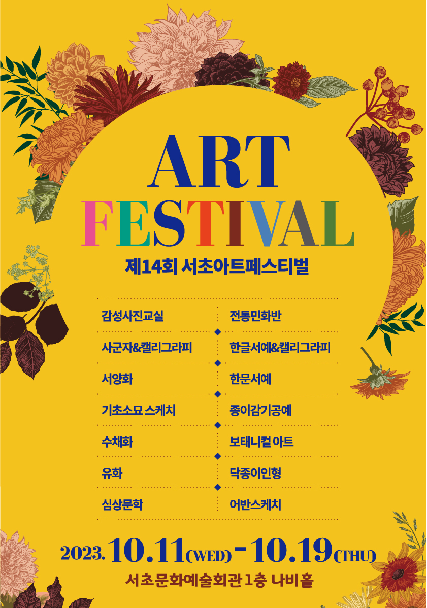 제14회 서초문화대학 아트페스티벌 페이지 정보 작성자 서초문화원 작성일23-11-21 15:21 조회2,374회 댓글0건 관련링크 이전글 다음글 목록 본문 행사명 제14회 서초문화대학 아트페스티벌 일시 2023.10.11. ~ 10.19. 장소 서초문화예술회관 1층 나비홀 공연정보 - 언론보도 - 이전글 다음글 목록