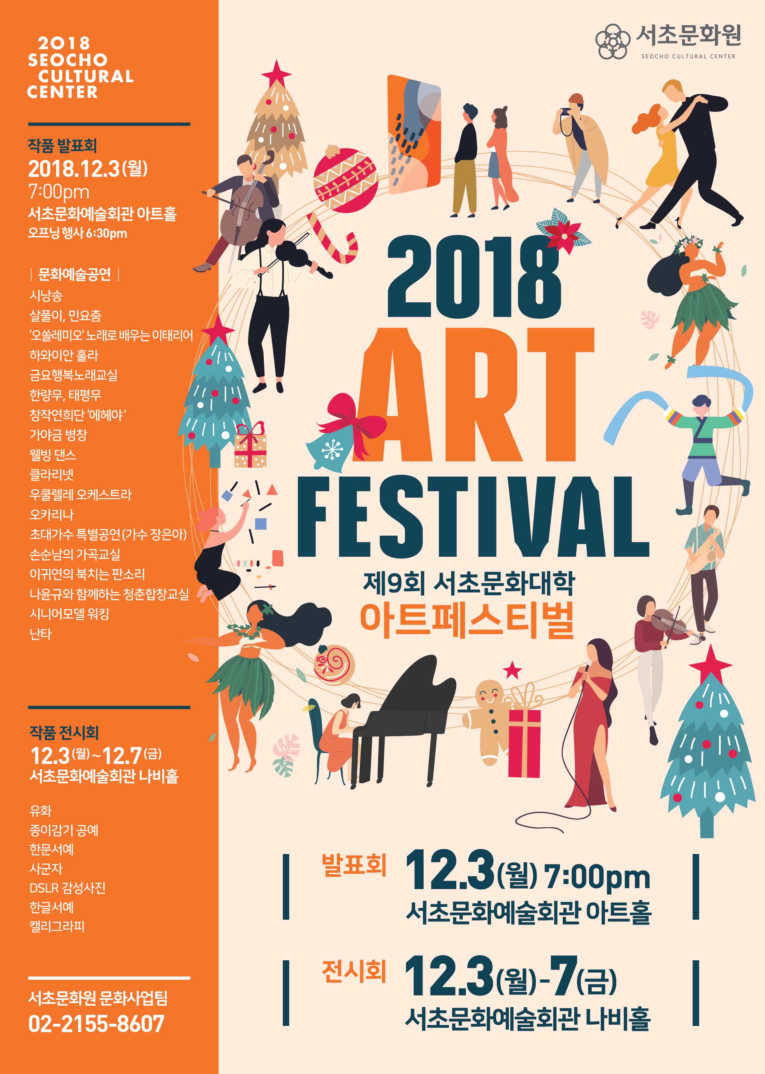 제9회 서초문화대학 아트페스티벌 페이지 정보 작성자 최고관리자 작성일19-01-07 11:03 조회5,780회 댓글0건 관련링크 이전글 다음글 목록 본문 행사명 제9회 서초문화대학 아트페스티벌 일시 2018년 12월 3일(월) ~ 12월 7일(금) 장소 서초문화예술회관 아트홀&나비홀 공연정보 서초문화대학 문화 예술 프로그램 강좌를 통해 최고의 강사들과 열정을 다해 참여한 수강생들의 노력의 결실과도 같은 작품을 선보이는 무대를 마련함으로써 구민들의 문화 , 예술 활동 및 정서 함양에 기여하는 뜻깊은 자리를 만들었다. 미술.서예.사진.공예 등의 작품 전시회도 12월 3일(월) ~ 12월 7일(금)까지 5일간 서초문화예술회관 나비홀에서 진행 되었다. 언론보도 . 이전글 다음글 목록