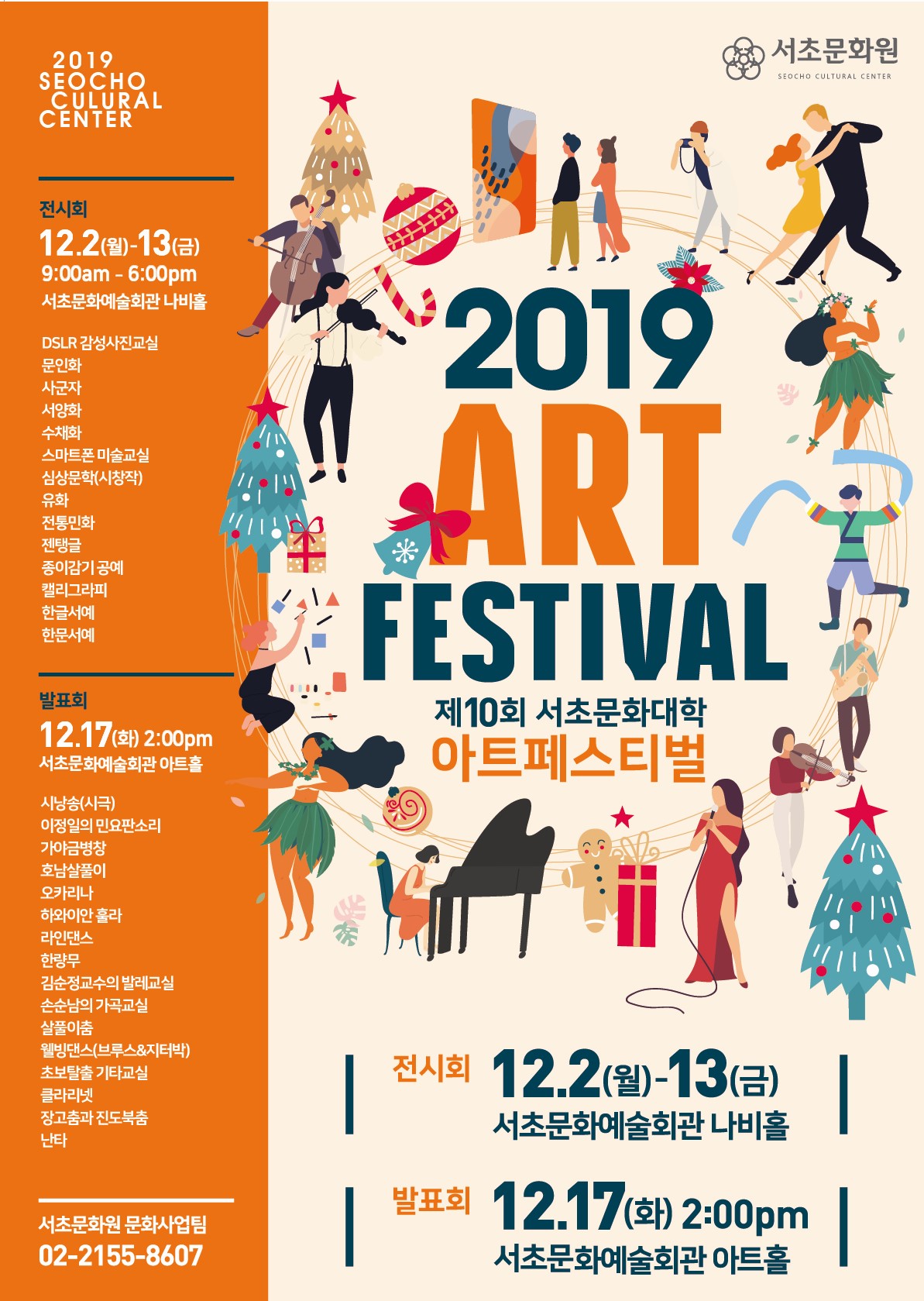 제10회 서초문화대학 아트페스티벌 페이지 정보 작성자 서초문화원 작성일20-01-16 16:20 조회5,103회 댓글0건 관련링크 이전글 다음글 목록 본문 행사명 제10회 서초문화대학 아트페스티벌 일시 2018년 12월 2일(월) ~ 12월 17일(화) 장소 서초문화예술회관 나비홀&아트홀 공연정보 ■ 작품전시회 : 12월 2일(월) ~ 12월 13일(금) 09:00~18:00 서초문화예술회관 나비홀■ 작품발표회 : 12월 17일(화) 14:00 서초문화예술회관 아 언론보도 이전글 다음글 목록