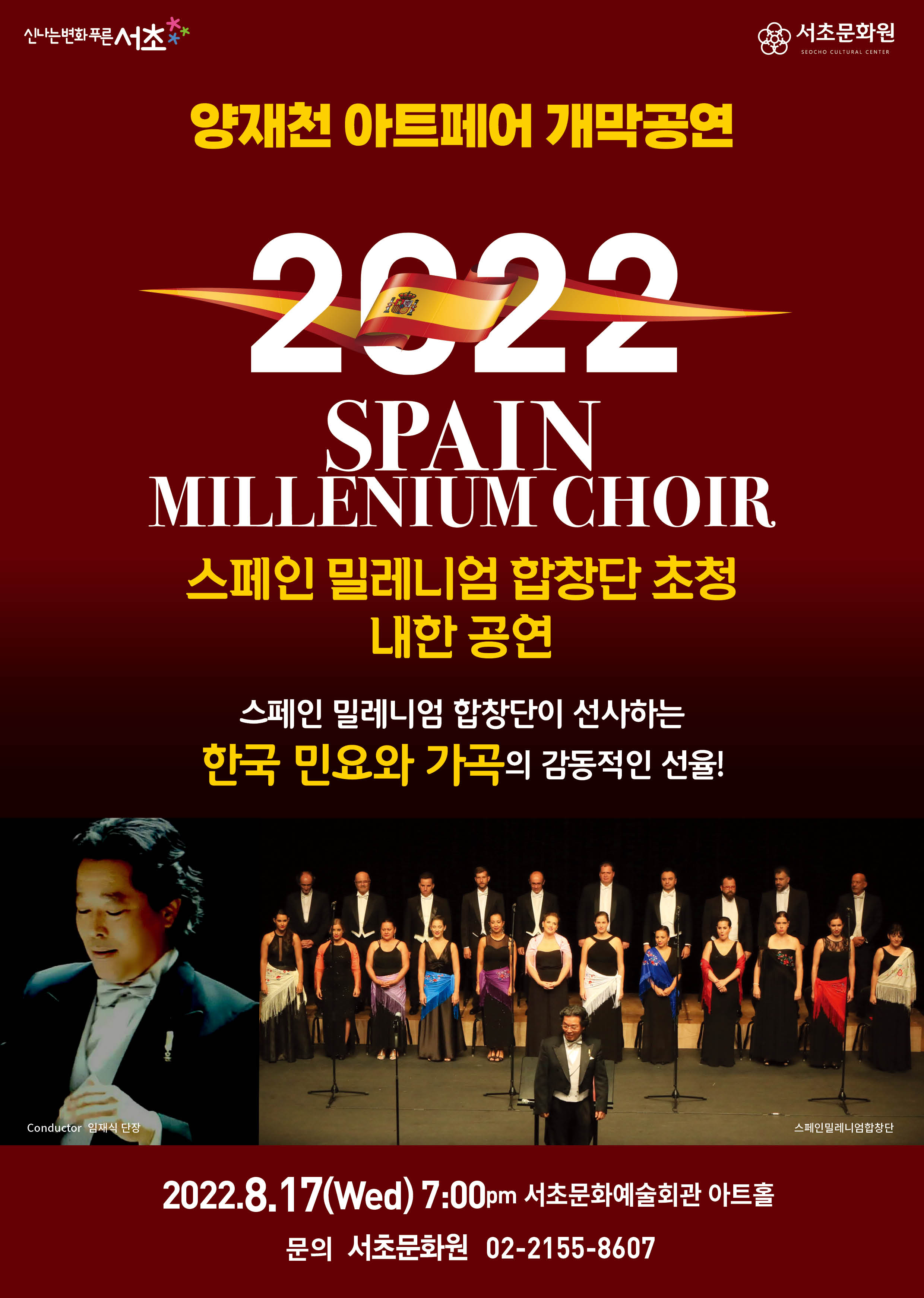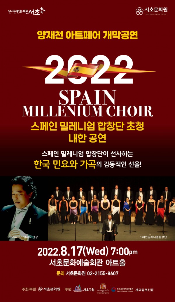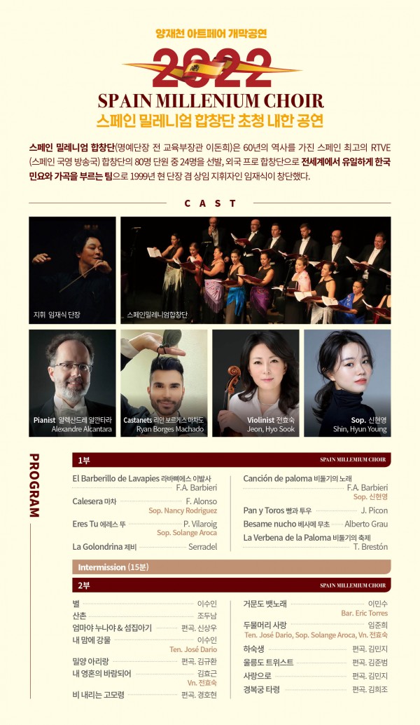 양재천 아트페어 개막공연 <스페인 밀레니엄 합창단 초청 내한 공연> 페이지 정보 작성자 서초문화원 작성일22-07-26 11:10 조회3,740회 댓글0건 관련링크 이전글 다음글 목록 본문 행사명 양재천 아트페어 개막공연 <스페인 밀레니엄 합창단 초청 내한 공연> 일시 2022.08.17.(수) / 19:00 장소 서초문화예술회관 아트홀 공연정보 스페인 단원들이 선사하는 한국민요와 가곡의 감동적인 선율!우리 전통가락과 스페인 감성이 함께 어우러지는 특별한 무대를 즐기며 잊지 못할 추억을 만들어 가시길 바랍니다! 언론보도 이전글 다음글 목록