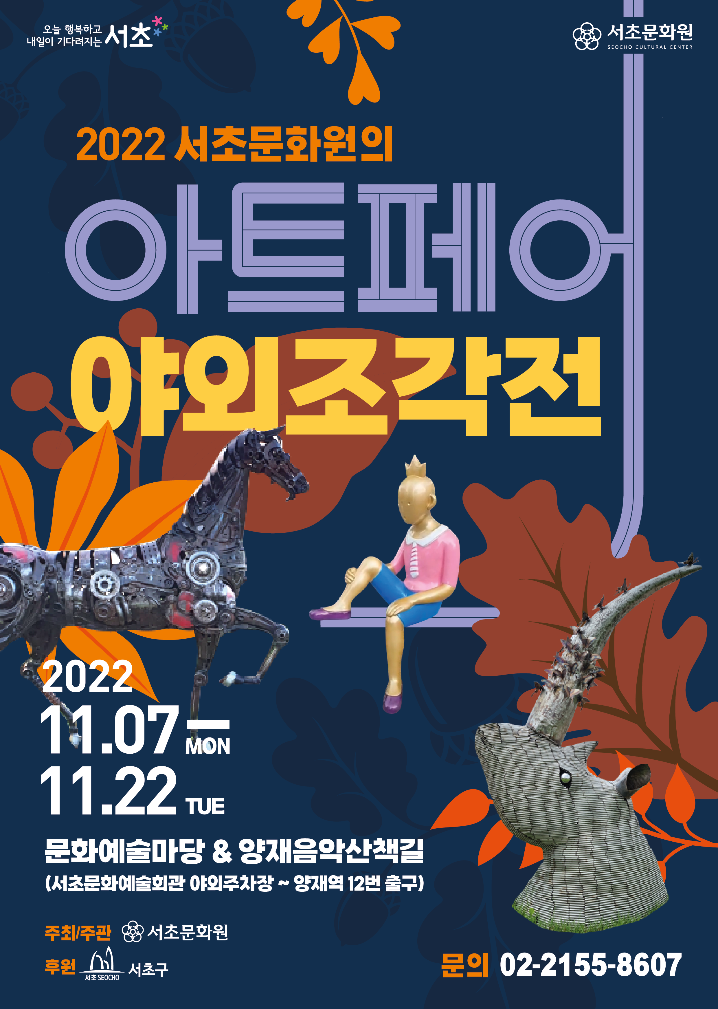 2022 서초문화원 아트페어 <야외조각전> 페이지 정보 작성자 서초문화원 작성일22-10-28 16:06 조회3,563회 댓글0건 관련링크 이전글 다음글 목록 본문 행사명 2022 서초문화원 아트페어 <야외조각전> 일시 2022.11.07.(월) ~ 11.22.(화) 장소 문화예술마당~양재음악산책길 공연정보 새로운 타입의 문화 예술 공간으로 재창조 될 ‘2022 서초문화원 아트페어 <야외조각전>’은 국내외 미술계에서 활발히 활동하고 있는 유명 조각가들의 작품이 17여 점이 전시될 예정이다. 언론보도 이전글 다음글 목록